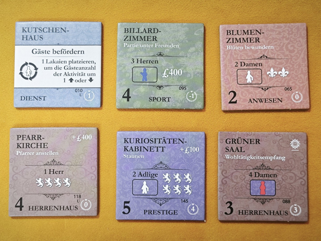 In Schritt 8 „Familientableau aufräumen“ folgen ein paar Sekunden Upkeep. Die Bediensteten, die in der aktuellen Runde verwendet wurden, kommen in den Bereich „genutzte Bedienstete“ und die gespielten Adelskarten auf den offenen, persönlichen Ablagestapel. Das verwendete Ausbau-Plättchen kommt zurück auf den Landgut-Planer, wird aber nach der ersten Nutzung in der Regel umgedreht, sodass ein Rosen-Symbol oben rechts sichtbar wird. Normale Ausbau-Plättchen zeigen auf der Rückseite eine etwas abgeschwächte Version der Aktivität, dafür aber mehr Siegpunkte als auf der Vorderseite. In der Regel lohnt es sich also am meisten jede Aktivität genau einmal auszuführen. Es gibt aber auch spezielle Ausbau-Plättchen: Flügelplättchen haben auf der Rückseite ein Monument und generieren, einmal umgedreht, in jeder Runde Ansehen; Mischplättchen haben auf beiden Seiten unterschiedliche Kategorien: eine Seite „Südlicher Park“ zeigt ein Plättchen der Kategorie „Sport“, welche die Aktivität Bogenschießen ermöglicht, während die andere Seite desselben Plättchens zur Kategorie „Anwesen“ zählt und die Aktivität Picknick mit Musik ermöglicht.