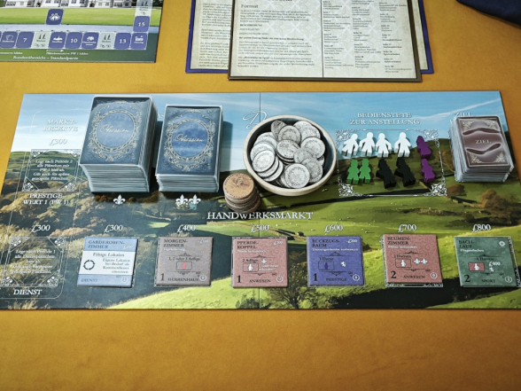 Noch ein Hinweis zu den zwei leeren Feldern linksseitig des Derbyshire-Tableaus: Ab dem Beginn der zweiten Periode werden hier alle Dienstplättchen auf das Feld der Marktreserve „Dienst“ platziert; und ab dem Beginn der dritten Periode landen alle Plättchen mit einem Prestigewert von 1 auf dem Feld der Marktreserve „Prestigewert 1 / PW 1“. Das sorgt dafür, dass der Markt nicht durch schwächere Ausbauten verstopft wird. Damit ist die Spielvorbereitung abgeschlossen.