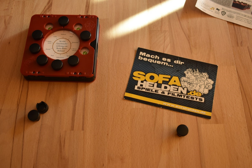 Der Spielaufbau ist dementsprechend einfach – auspacken, auf den Tisch stellen, fertig. Ok, nicht ganz so einfach, natürlich muss man die Karten noch auspacken und die vier Zähler zurücksetzen. Teilnehmen können am Spiel bis zu vier Quizbegeisterte oder vier Teams. Bevor es losgehen kann, wählt man sich noch eins der Symbole, die neben den Zählern abgebildet sind, um seine Punkte später zählen zu können. Dann werden, sofern nicht schon geschehen, die zehn Antwortmarker in die Antwortlöcher gesteckt und - sofern notwendig - die oberste Karte nach unten gesteckt. Dann darf auch schon das jüngste Mitglied der Runde beginnen…