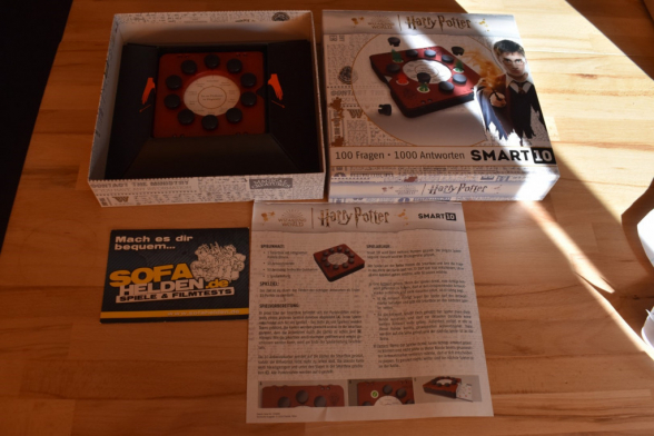 Das Spielmaterial zu Smart 10 Harry Potter ist sehr übersichtlich. Oben auf liegt die Anleitung, darunter - schön eingefasst - die Smartbox, in der die eingeschweißten Quizkarten auf ihren Einsatz warten. Aufgrund ihrer Kompaktheit und der Tatsache, dass sowohl die Antwortmarker als auch der Verschluss auf der Seite sehr gut halten ist das Spiel super für Reisen geeignet.
