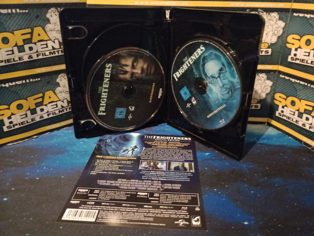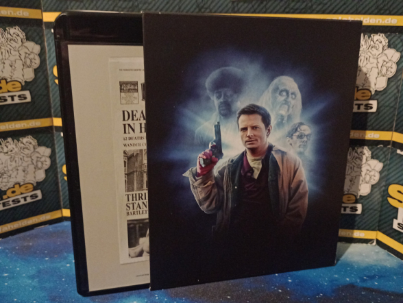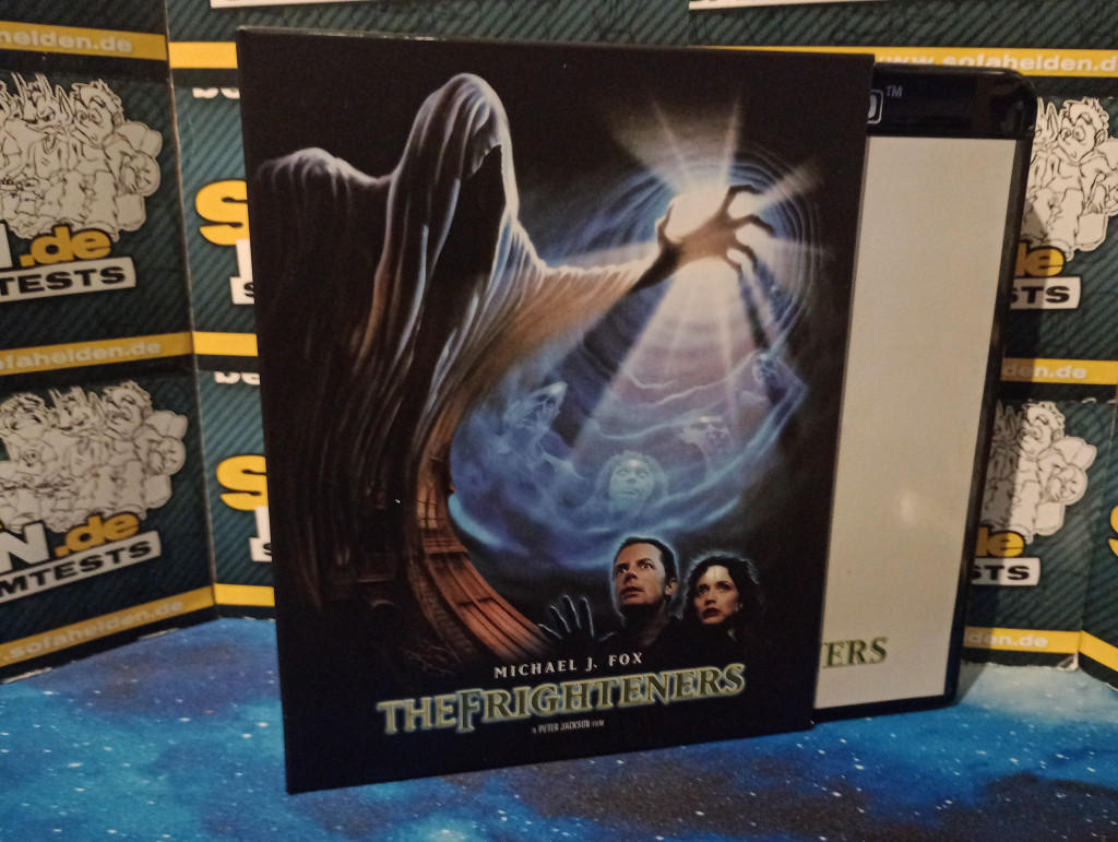 Die Full Slip Edition bietet auf dem Slip-Cover das gleiche Motiv wie die Mediabook-Variante C und zeigt im Vordergrund Michael J. Fox und Trini Alvarado gemeinsam mit dem Sensenmann, während im Hintergrund einige Geister sowie das "Licht am Ende des Tunnels" zu sehen sind. Die Rückseite zeigt dagegen Frank Bannister mit seinen drei Geister-Kollegen, während das Infoblatt mit den üblichen Inhaltsangaben und Details lediglich lose aufgelegt wurde. Die Softbox im Inneren bietet schließlich das altbekannte Covermotiv von The Frighteners, welches auch auf der Mediabook-Variante A zu sehen ist. Auf dem Backcover ist ein Zeitungsausschnitt aus der Fairwater Gazette zu sehen, der sich mit dem Fall Johnny Bartletts beschäftigt. Die drei Discs der Full Slip Edition umfassen die Kinofassung sowie den Director´s Cut, jeweils auf einer 4K UHD, sowie eine Bonus Blu-ray mit über sechs Stunden Extras, wobei vor allem das 95-minütige Interview mit Cast & Crew sowie das unglaubliche 270-minütige Making-Of hervorzuheben sind.