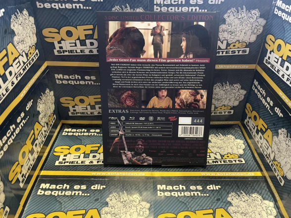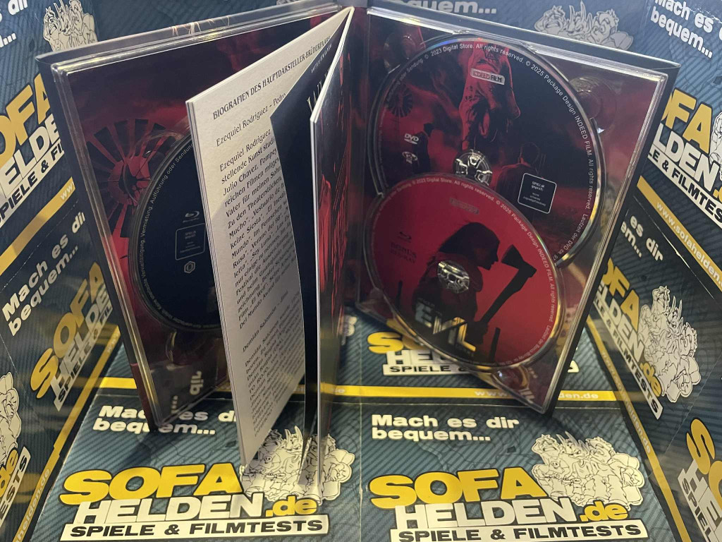 Das Mediabook ist in mehreren Cover-Varianten erhältlich, sodass Indeed Film wirklich jeden Geschmack trifft. Wir haben als Muster Cover-Variante Typ F bekommen, auf dem der Hauptdarsteller zu sehen ist – darüber eine dämonische Hand, die sich bedrohlich über seinen Kopf legt. Die Rückseite bietet sämtliche Infos zum Film, Szenenfotos sowie die Limitierungsnummer (Typ F ist auf 444 Stück limitiert). Als Veredelung sind der Titel auf der Vorderseite und die Szenenbilder auf der Rückseite mit einem glänzenden Finish versehen. Innen liegen die DVD und die Blu-ray mit dem Film sowie eine Bonus-Blu-ray mit zusätzlichem Material. Das eigentliche Highlight ist jedoch das 48-seitige Booklet von Thorsten Hamisch, das Hintergrundinfos, Bilder und Kontext zum Film liefert – ein echter Mehrwert für Sammler. Cover & Bilder © Cover und Szenenfotos: indeedfilm / Fotos vom Mediabook: www.sofahelden.de Das Fazit von: Panikmike