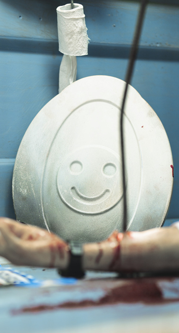 Um unterdessen den anfänglichen Erwartungen gerecht zu werden, bedient Ach du Scheiße! zwischendurch aber dann doch auch die Freunde des geneigten Fun-Splatters, und präsentiert immer wieder sehr blutige, deftige Gewaltspitzen, die dabei handwerklich auch noch hervorragend umgesetzt wurden. In diesem Bereich gibt sich Ach du Scheiße! damit ebenfalls keine Blöße, und garniert das ganze zudem mit genau dem Ekelfaktor, auf den man eigentlich nur wartet, bei einem Film, der komplett in einem Dixie-Klo spielt.