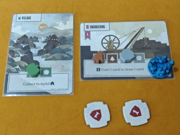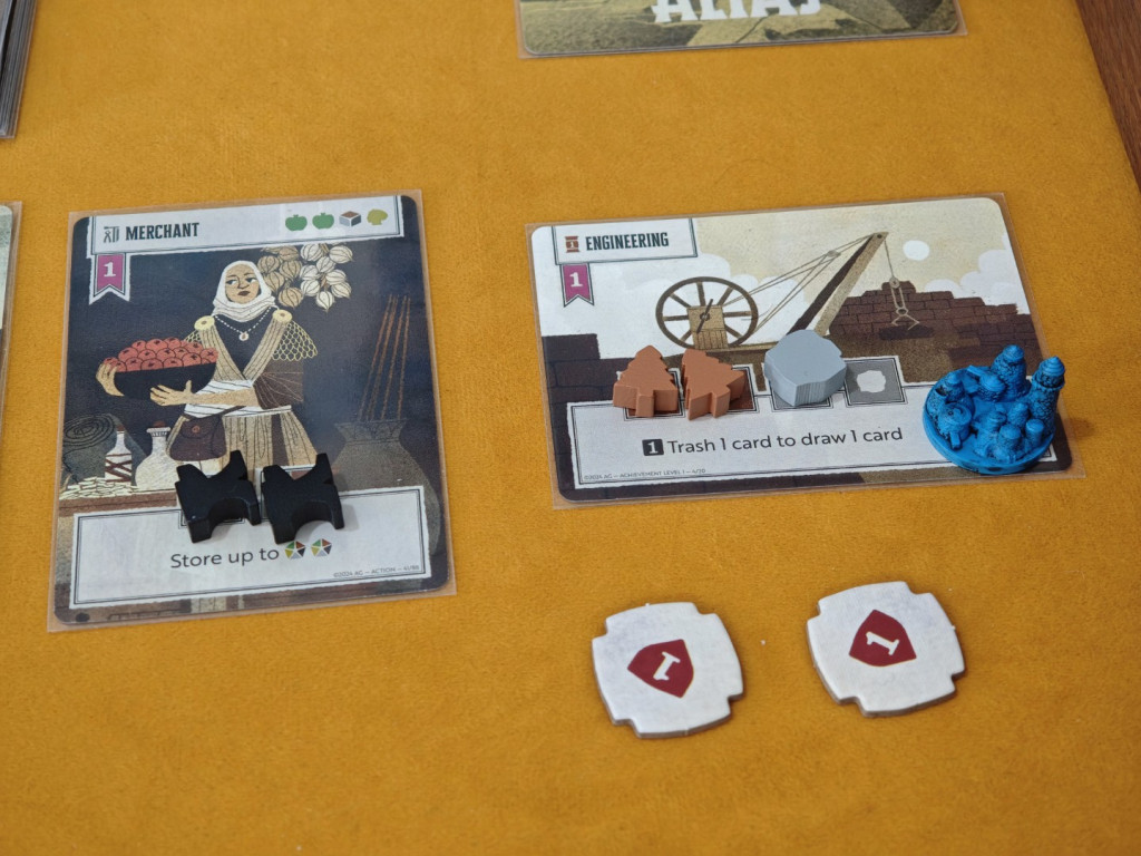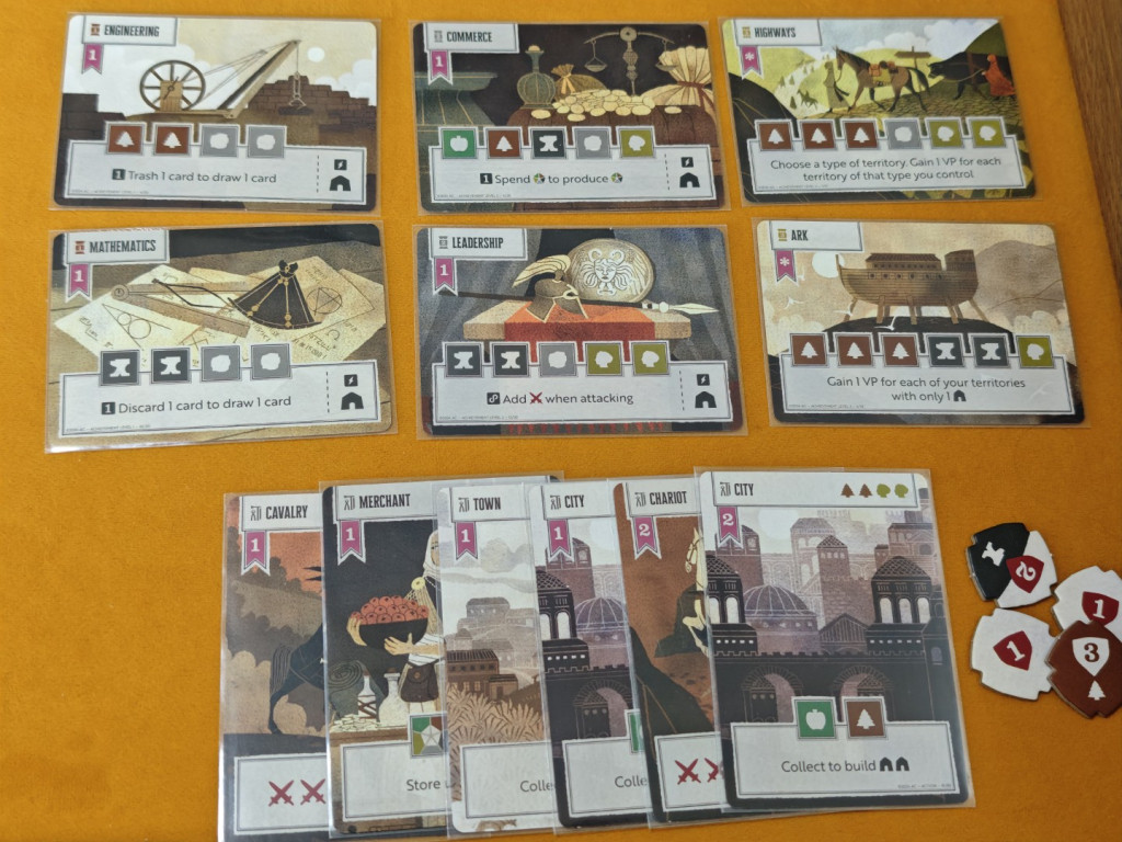Zuletzt ist noch die Aktion „Errungenschaft entwickeln“ von zentraler Bedeutung, gerade für die Siegpunktgenerierung im Endgame. Das funktioniert ähnlich wie „Siedlungen bauen“. Statt einer Karte von der Hand wählt man eine verfügbare Errungenschaftskarte aus der Auslage. Dabei gibt es zwei Bedingungen: Erstens darf man nur dann eine Karte eines höheren Levels wählen, wenn man bereits mindestens ebenso viele Karten des niedrigeren Levels fertiggestellt hat. Man darf also niemals mehr Level-2-Errungenschaften als Level-1-Errungenschaften haben (analog für Level 3 zu Level 2). Die zweite Voraussetzung ist, mindestens eine der benötigten Ressourcen zu besitzen, um die Entwicklung zu beginnen. Diese wird auf der Karte platziert. Ressourcen können über mehrere Runden gesammelt werden. Es darf jedoch immer nur eine Errungenschaft zur selben Zeit entwickelt werden, niemals mehrere gleichzeitig.