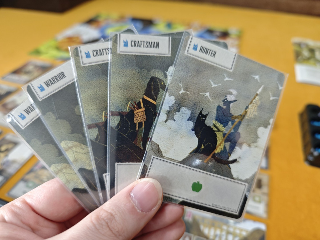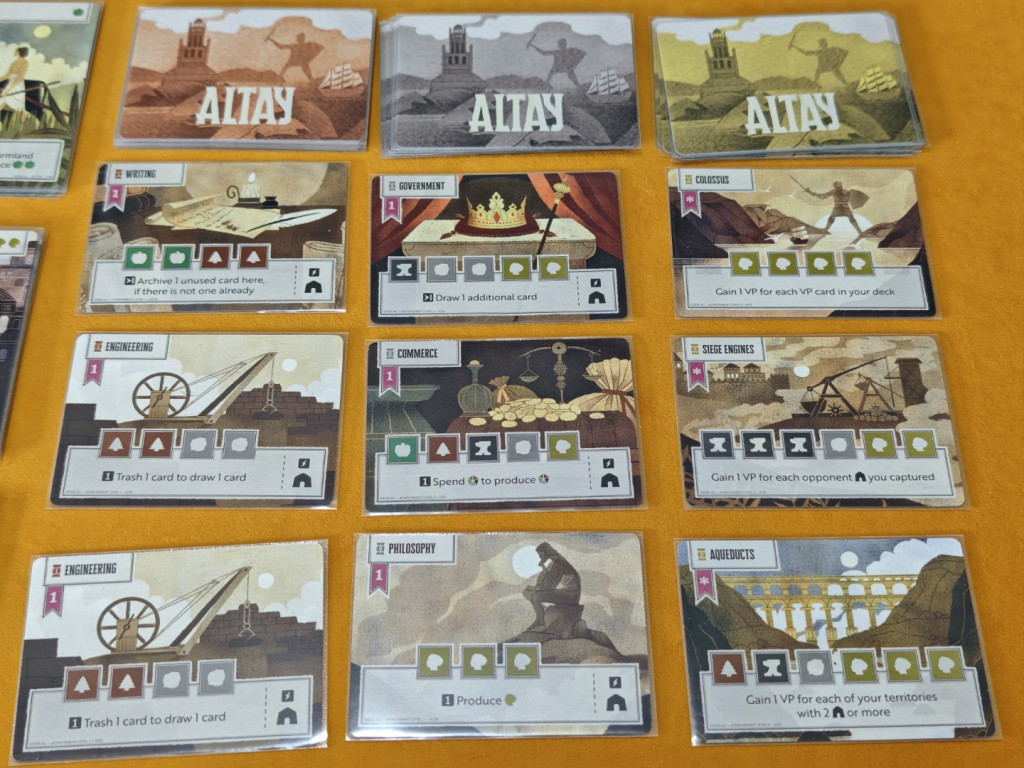 Der Fokus auf Deckbuilding und Ressourcenmanagement hat uns sehr gefallen, gerade weil wir Fans von Deckbuildern sind und viele Area-Control-Spiele als zu bestrafend empfinden. In Altay gibt es, wie in anderen Deckbuilding-Spielen, viele Möglichkeiten, die durch die Errungenschaftskarten freigeschaltet werden: Man kann Karten aus dem Deck verbannen, Karten schneller nachziehen, seine Kartenhand vergrößern und vieles mehr. Leider sind die Deckbuilding-Aspekte wenig mit der Gebietskontrolle verzahnt. Es gibt zwar Karten, die mehr Ressourcen produzieren, wenn man in entsprechenden Regionen Siedlungen errichtet hat, aber das ist auch schon alles. Hier hätte man mehr herausholen können. Aber vielleicht will Altay gar nicht so komplex sein.