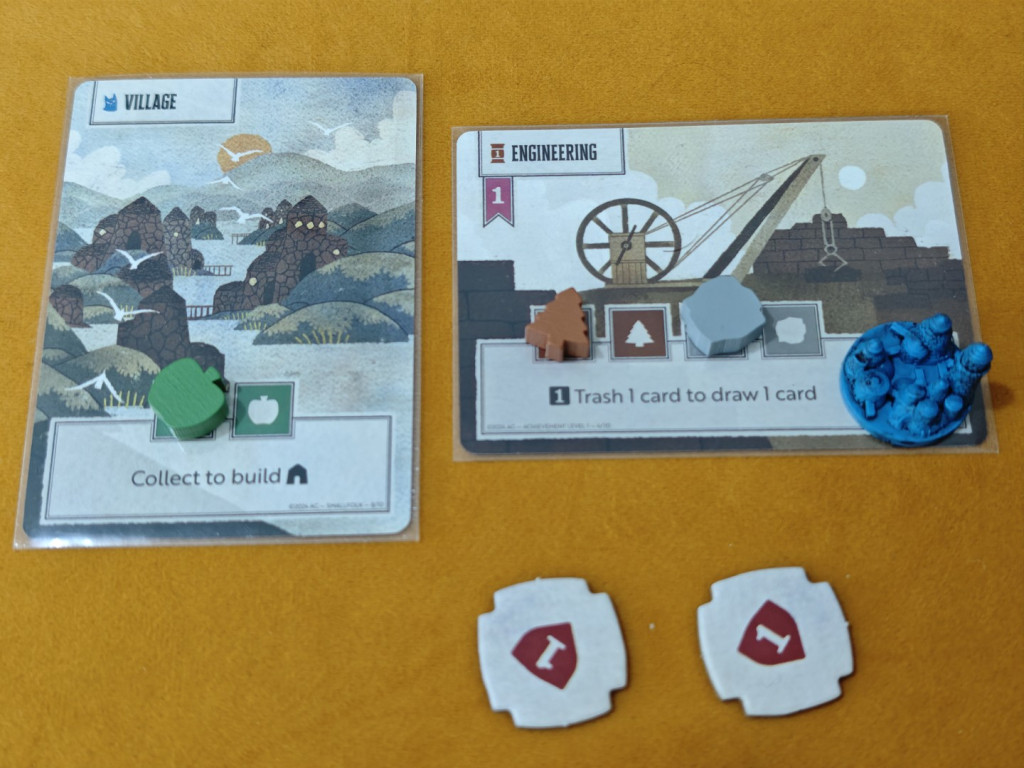 Level-1- und Level-2-Errungenschaften schalten Sonderfähigkeiten frei und erlauben bei Fertigstellung den Bau einer Siedlung. Level-3-Errungenschaften werden auch „Wunder“ genannt und schalten Siegpunktbedingungen am Spielende frei. So kann jede Level-3-Karte bis zu 7 Siegpunkte generieren. Errungenschaftskarten sind also ein entscheidender Schritt auf dem Weg zum Sieg.