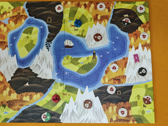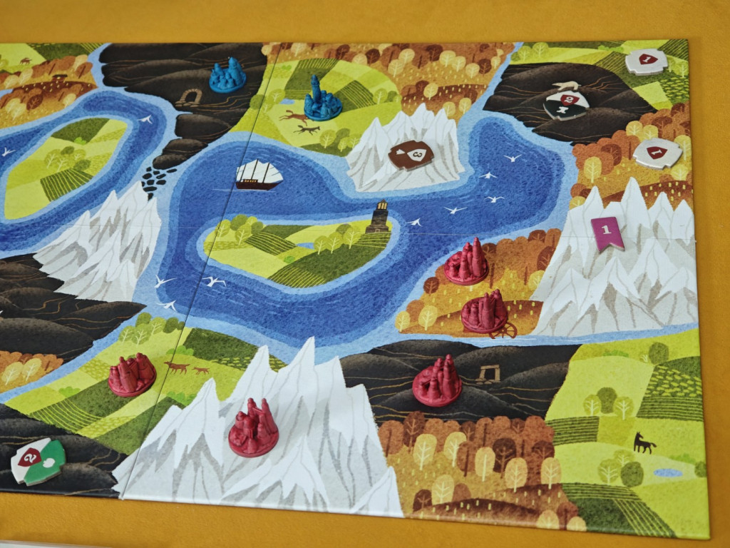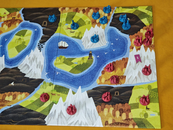 Was wir richtig schade finden: Es gab wohl ein Promo-Set, das es ermöglichte, den See im Zentrum des Spielplans mithilfe einer zwölften Aktionskarte zu überqueren. Das entschärft vermutlich die Problematik der 3-Spieler-Partie. Aber ganz ehrlich: Wie kann man im Zentrum des Spielplans eines Grundspiels einen See mit einer Insel darauf abdrucken, wenn diese Elemente ohne eine Promo nicht bespielbar sind? Die Antwort gibt es bereits: Es ist wohl eine große Seefahrer-Erweiterung geplant.
