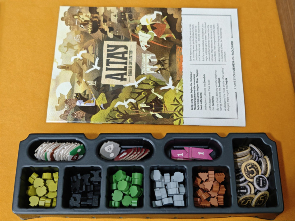 Neben dem Spielplan wird der Ressourcenvorrat platziert. Altay kommt mit einem Ressourcen-Tray, das mit den Tokens für Nahrung, Holz, Metall, Stein und Kultur direkt auf den Tisch gestellt werden kann. Wird mit der optionalen Handelsregel gespielt, müssen auch die Geldmarker bereitgelegt werden.