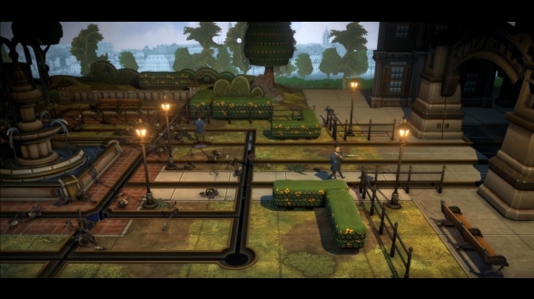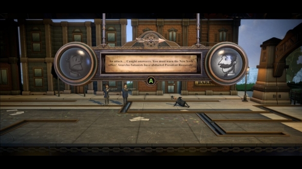 Hier befinden sich im Hintergrund Häuserfassaden, während sich im Vordergrund auf verschiedenen Bahnen weitere Zinnfiguren tummeln. Unsere gewählte Spielfigur spaziert (rollt) auf seiner Bahn. Über einen Dialog erfährt der Spieler, dass es ein schöner Tag für einen Spaziergang ist und sich alle Menschen auf den Besuch von Präsident Roosevelt freuen würden. Als Agent des Secret Service wäre man ja sehr um das Wohlergehen des Präsidenten bemüht. Kaum hat er es ausgesprochen, so bemerkt einer einen Aufruhr im Park. Er nimmt sein Gewehr und eilt auf festen Bahnen an den Ort des Geschehen. Ashworth, ein weiterer Agent des Secret Service weiß vor seinem Tod zu berichten, dass der Präsident entführt wurde. Die Täter sind schnell identifiziert.  Es handelt sich um Anarcho-Satanisten. Das sind nicht nur Satanisten, nein, es sind Satanisten der übelsten Sorte. Als letzte Handlung kann der sterbende Ashworth noch auf eine vermummte Gestalt zeigen, welche (wie jeder gute Satanist) eine Art Kutte trägt. Dies muss natürlich einer der Anarcho-Satanisten sein. An dieser Stelle übergibt das Spiel dem Spieler das erste Mal die Kontrolle. Mittels eines einfachen Tutorials werden die Steuerungsgrundlagen erklärt. Bei der Steuerungsvariante mit einem Controller wird beiden Steuerkreuzen gesteuert. Das linke Steuerkreuz dient dabei der Bewegung auf den vorgegebenen Bahnen, also oben, unten, rechts und links. Das zweite Steuerkreuz wird verwendet um die Schusswaffe zu steuern. Der Spieler ist für die Steuerung also intensiv mit beiden Händen beschäftigt. Dabei geht es im ersten Level zu Beginn noch sehr überschaubar mit Nahkampfgegnern zu. Diese wollen meiner Spielfigur nahkommen um erstmal Schaden anzurichten. Meine Figur verfügt über ein Gewehr und eine Pistole. Diese haben allerdings eine begrenzte Anzahl von Munition. Dabei ist die Pistole sowas, wie die letzte Versicherung, da sie über 999 Schuss verfügt, welche erstmal verballert sein wollen. Neben dem Gewehr und der Pistole kann unsere Spielfigur eine weitere Waffe (welche klangvolle Namen wie "Tates Fahrkartenentwerter" tragen) mit sich führen. Eine solche Zusatzwaffe will aber zunächst finanziert sein. Dazu verlieren Gegner, wenn sie besiegt wurden, einen kleinen Betrag an Cents. Dieses Geld kann nachher eingesetzt werden um verschiedene Kleidungsstücke oder Waffen zu erwerben. Die Kleidungsstücke haben dann einen positiven Einfluss. So kann der Cowboy-Hut zu einer höheren Schussrate verhelfen. Dadurch wird ein gewisser Sammelaspekt mit ins Spiel gebracht. Zunächst geht es darum alle Nahkampfgegner im ersten Level zu besiegen. Während der Spieler das Level erforscht gibt es verschiedene Wegpunkte. So finden sich Checkpoints, welche ein Weiterspielen von diesem Punkt aus erlauben. Dies gilt allerdings nicht unbegrenzt. Verliert der Spieler dreimal alle Lebenspunkte, so muss er dieses Level neu beginnen. Daneben finden sich Munitionsboxen, welche die Munition wieder auffüllen und Lebensstationen. Diese heilen eine unterschiedliche Anzahl von Lebenspunkte. Mehr brauch ein Spieler eigentlich nicht zu wissen. Anschließend kann die Reise zur Rettung des Präsidenten beginnen.