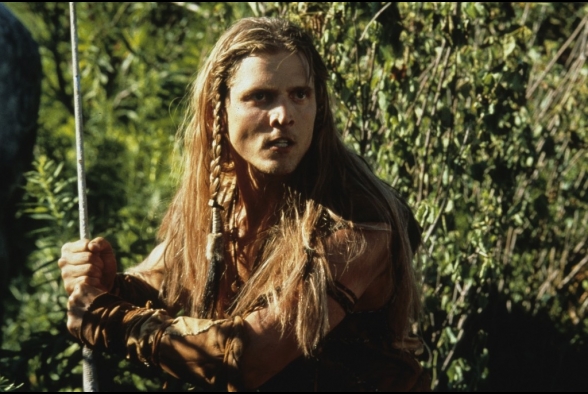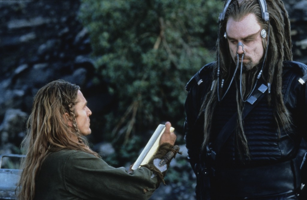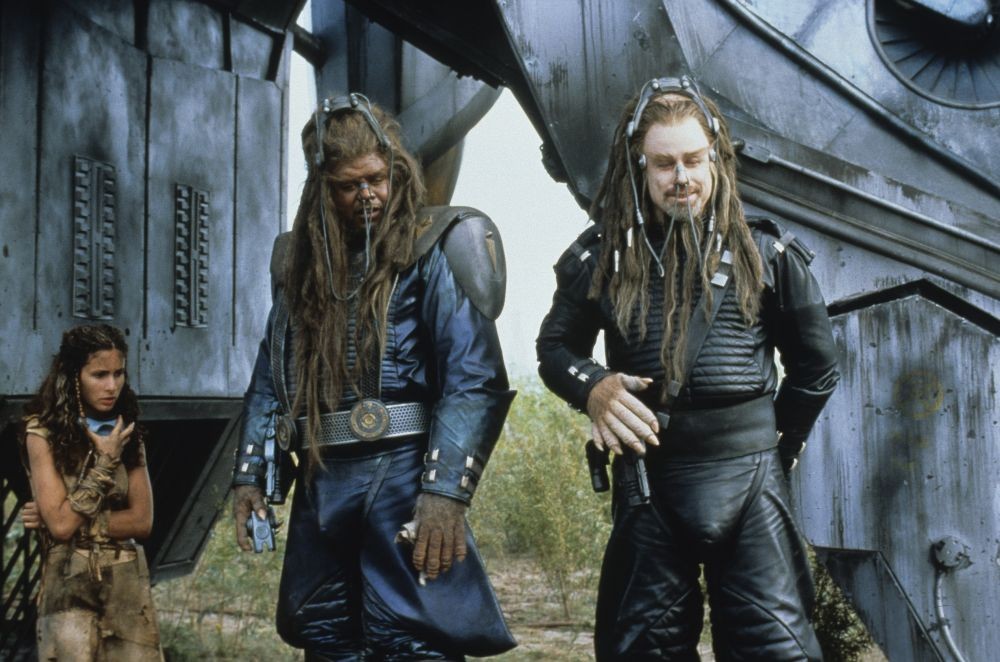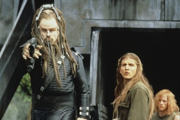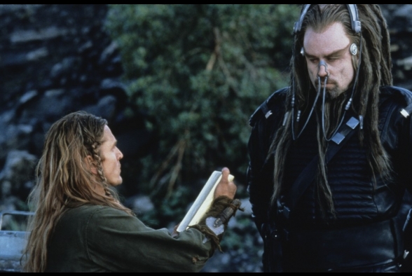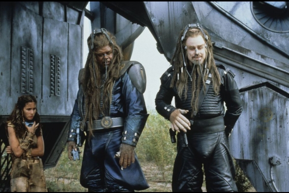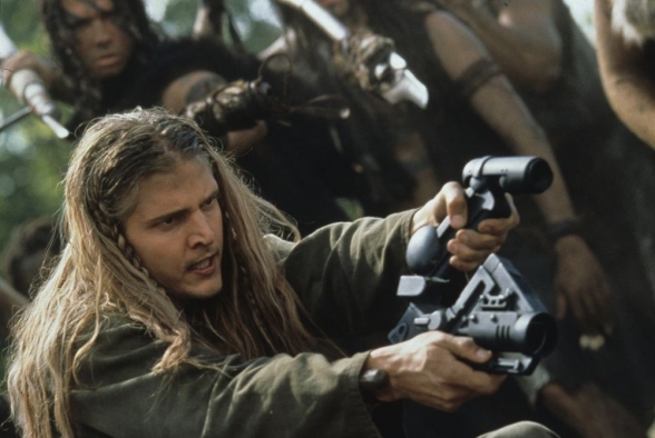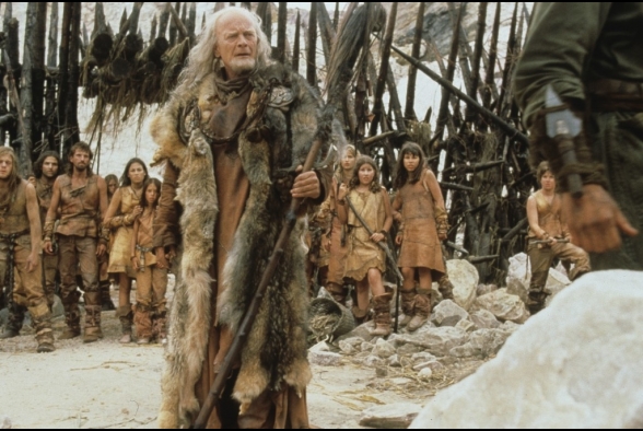 Wir schreiben das Jahr 3000, oder würden wir, könnten wir noch schreiben, das braucht nämlich im Prinzip kein Mensch. Seit 1000 Jahren wird die Erde von einer weit überlegenen Alienrasse namens Psychlos unterjocht. Überlegenheitsverhältnis so circa Fußmatte zu Toastbrot. Doch dazu später mehr. Die Menschheit hat sich ihrer alten Tugenden besinnt und während des Rückzugs alle modernen Errungenschaften vergessen. Waren eh uncool. Alte Götter sind wieder hip, Wissen ist out und Pferde sind die neuen Ferraris. Zugleich haben es aber diese überaus hochentwickelten Psychlos nicht zustande gebracht, alle Menschen zu finden und zusammenzupferchen und so ist die Bevölkerung in einzelne Stämme ohne störenden Intellekt zerbrochen. Wenn diese nicht gerade damit beschäftigt sind, ihre 3-Wetter-Taft-Frisur in Schuss zu halten, verkloppen sie Plastikdrachen aus Freizeitparks und beten Steinstatuen an. So auch Jonnie Tyler, der ausgezogen ist, mal ein ernstes Wörtchen mit seinen Göttern zu wechseln, weil sie sind schon ordentlich asozial, einfach so da rum zu stehen und blöd zu glotzen. Schon an dieser Stelle gingen mir die Hände aus, die ich über dem Kopf zusammen schlagen konnte, doch weiter. Dem Film geht noch lange nicht das Pulver aus.
