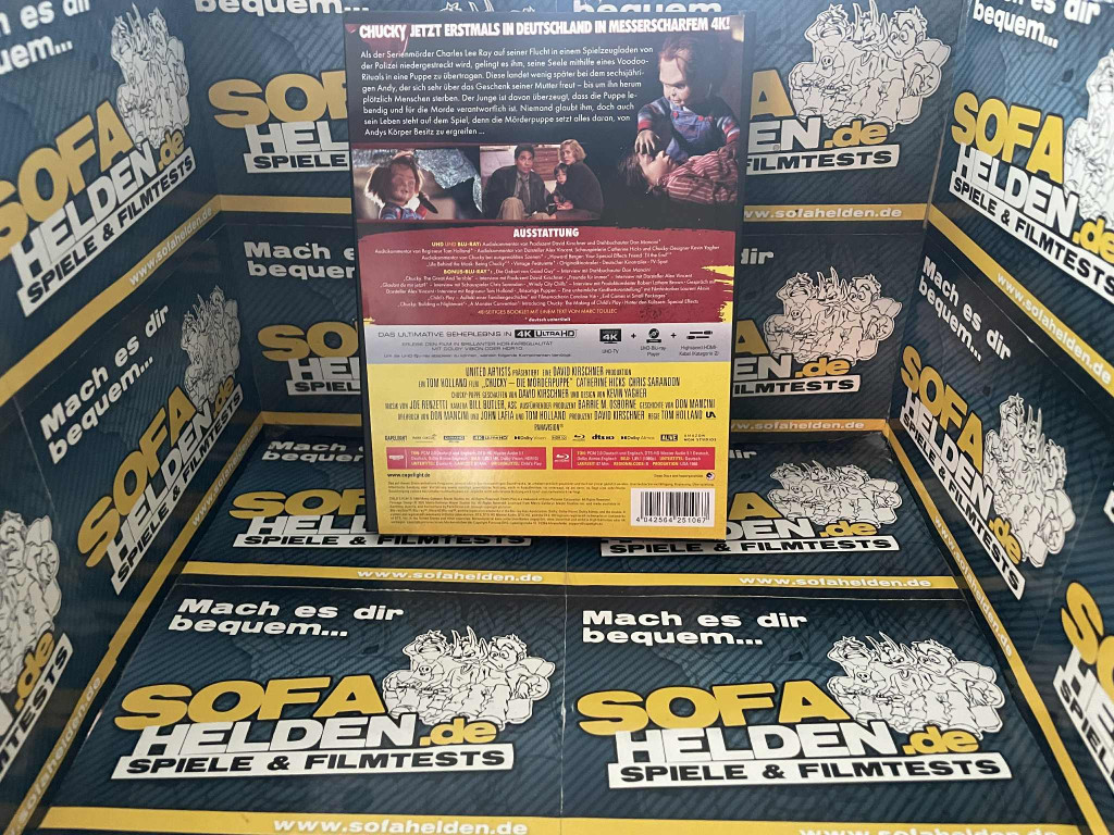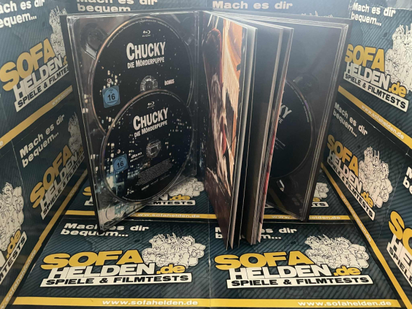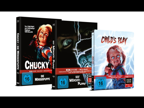 Capelight hat sich entschieden, zwei verschiedene Cover-Varianten des Mediabooks zu veröffentlichen. Das alte Kinoplakatmotiv ist exklusiv im Capelight-Shop erhältlich und zeigt ein Wohnhaus mit den Augen von Chucky. Damals wusste man noch nicht, wie die Mörderpuppe tatsächlich aussieht und was einen im Kino erwarten würde, daher gab es Chucky nicht direkt zu sehen. Die andere Covervariante ist in Schwarz gehalten und zeigen Chucky in einer angreifenden Pose mit einem Messer – es ist das alte Motiv der damaligen Veröffentlichung. Feine Details wie ein glänzender Lackeffekt über dem Messer auf der Vorder- und Rückseite verleiht der Edition eine besonders hochwertige Optik. Die Veröffentlichungsdetails befinden sich auf einer lose beiliegenden J-Card. Im Inneren des Mediabooks sind die 4K UHD, die Blu-ray sowie eine Bonus-Blu-ray mit zahlreichen Extras enthalten. Abgerundet wird das Ganze durch ein 50-seitiges Booklet mit vielen Fotos und einem Text von Marc Toullec.