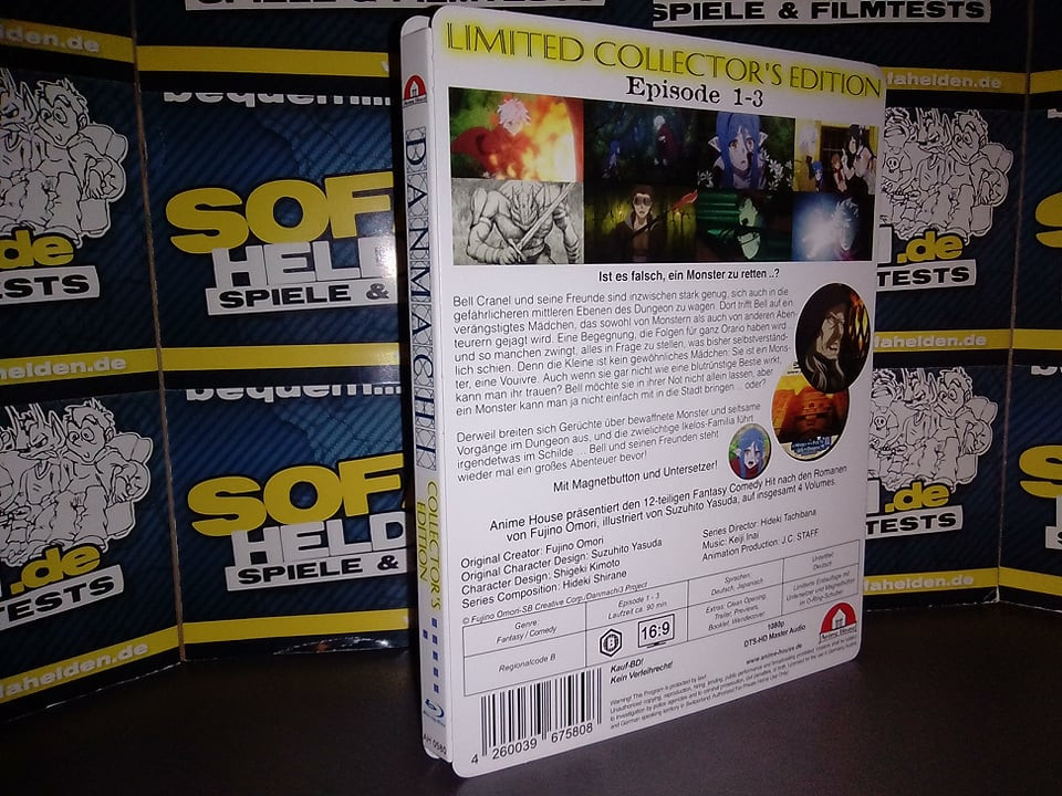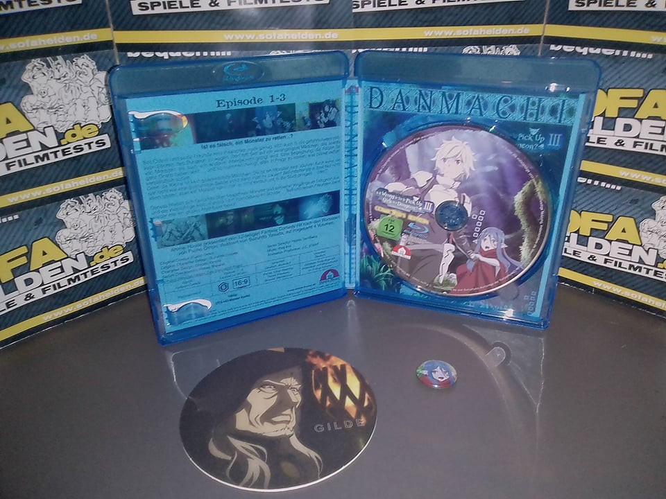 Die "Familia Myth" geht in die dritte Runde, aber bei der Collector´s Edition bleibt alles beim Alten. Danmachi - Staffel 3 - Vol. 01 erscheint stilgerecht und passend zu den bisherigen Veröffentlichungen als Softbox im O-Card Schuber, wobei auf dem Cover von Softbox und Schuber, ebenso wie auf der Disc selbst, ein Motiv von Bell Cranel gemeinsam mit der Voivre Wiene abgebildet ist. Wiene ist auch auf dem Magnet-Button zu sehen, während der Untersetzer die Gilde beziehungsweise das Antlitz Uranus´ zeigt. Die Infos zur Edition sind wie gewohnt sowohl auf der Rückseite der Softbox, wie auch auf der Rückseite des Schubers zu finden. Abgerundet wird die Collector´s Edition von einem 16-seitigen Booklet (ebenfalls mit dem gleichen Covermotiv), das außer einem ausführlichen Episodenguide auch zahlreiche interessante Hintergrundinformationen zur Handlung der ersten Volume beinhaltet.
