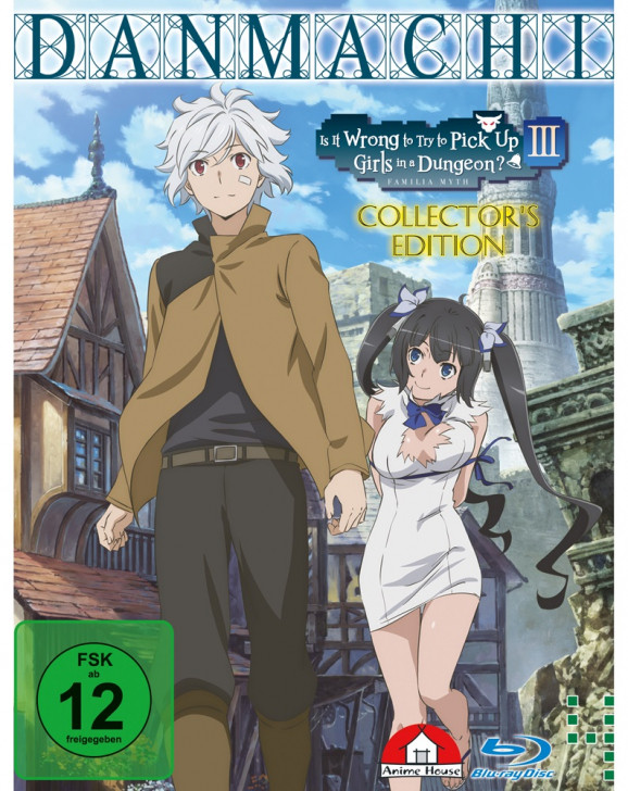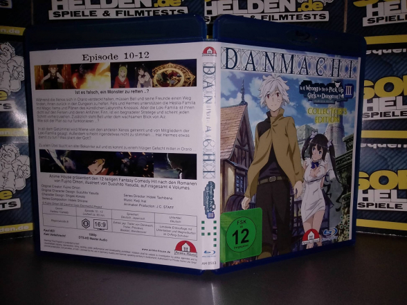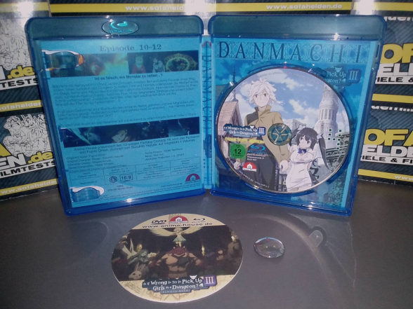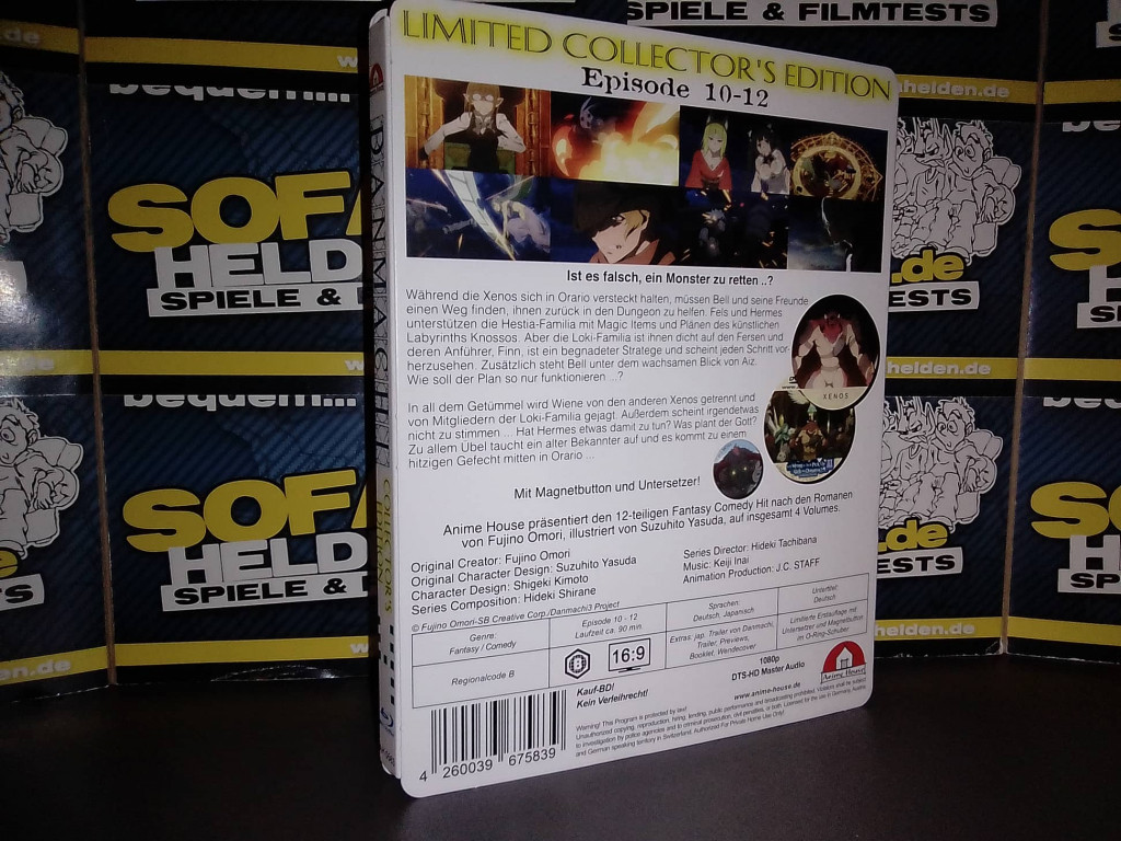 Die Limited Collector´s Edition bleibt ihrer Linie weiterhin treu, und erscheint wie gehabt als Softbox im O-Card Schuber. Das durchgängige Covermotiv, welches sich auch auf der Disc fortsetzt, zeigt zum Abschluss ein Motiv von Bell Cranel und der Göttin Hestia auf den Straßen Orarios. Der Untersetzer steht ganz im Zeichen der Xenos, während der Magnetbutton den schwarzen Stier Asterios zeigt. Das 16-seitige Booklet präsentiert den üblichen, ausführlichen Episodenguide, und wirft zudem einen Blick auf die zwei mächtigsten Familias. Außerdem bietet es erneut einen tieferen Einblick in die Handlung und liefert zudem weitere Hintergrundinformationen. Abgeschlossen wird das Booklet mit einem umfassenden Blick auf alle Synchronsprecher der dritten Staffel.