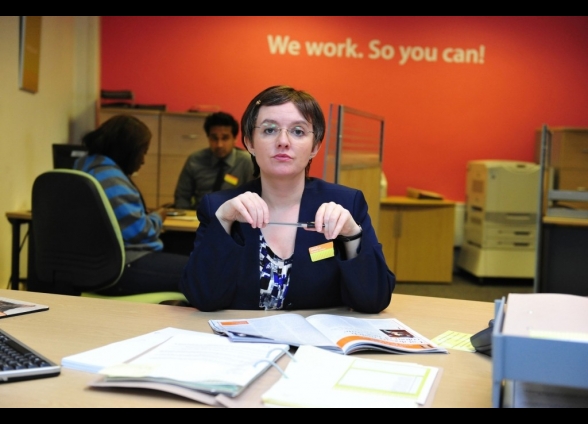 Angela Bromford (Jo Enright) Angela ist zwar eine nette Person, vor den Arbeitssuchenden und Kollegen spielt sie aber die taffe Frau. Sie macht keine Ausnahmen, ist sehr streng und wenn man ihr blöd kommt, dann hat man schon verloren. Obwohl sie aber so stringent ist, so hält sie sich nicht an alle Regeln und zeigt ihrer Chefin in manchen Situationen sogar, dass ihr vieles am Arsch vorbeigeht.