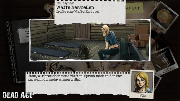 Im Camp gibt es verschiedene Anlaufstationen, welche ich alle besuchen kann. So gibt es die Bar, wo ich weitere Überlebende treffen und neue Quests aufnehmen kann. Diese Quests bestehen meist daraus, dass wir eine der nahen Lokationen besuchen und irgendjemanden beschützen oder etwas holen sollen. Weiterhin gibt es einen Händler bei dem wir Gegenstände gegen Material erwerben können. Die Überlebenden, welche sich nach und nach um mich scharren, können je nachdem auch Jobs ausführen oder mich bei der Erkundung der angrenzenden Gegenden begleiten. Jobs können dabei aus den Bereichen Jagen oder Wachen bestehen. Dabei wird zum einen Nahrung gejagt, zum anderen wird das Lager für Plünderern oder Zombies bewacht. Es gibt aber Jobs, welches das Herstellen von Gegenständen umfasst. So kann ein Arzt beispielsweise Medikits craften, sofern die benötigten Materialien zur Verfügung steht.