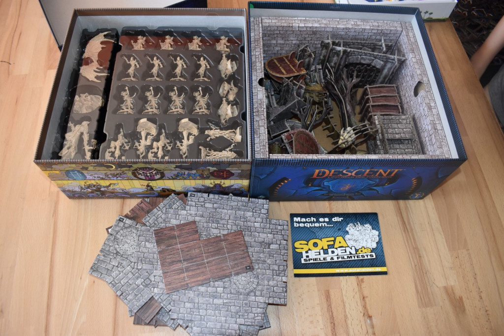 Wie bereits erwähnt wird beim Umfang des Spielmaterials schon einmal geklotzt. Besonderes Highlight sind hierbei die 40 Kunststofffiguren. Sie sind sehr liebevoll und detailliert gestaltet und müssen vor dem ersten Spiel auch noch zusammengesteckt werden. Außerdem gibt es zahlreiche Würfel und ID-Marker. Hier seien letztere positiv hervorgehoben, bei denen man auch an Spielende mit Farbsehschwäche gedacht hat. Da Descent sehr kartenlastig ist, gibt es auch hiervon einige, die bereits in wiederverschließbaren Zipp-Beuteln untergebracht sind. Für bestimmte Kartenarten liegen sogar noch Hüllen bei. Neben den noch relativ gewöhnlichen Spielplanteilen und Unterlagen gibt es aber auch - und das lässt das Herz der Dungeon-Crawler-Fans höher schlagen - eine Menge an 3D-Geländeteilen, die gemäß der beiliegenden Bauanleitung zusammengesetzt werden müssen. Natürlich gibt es auch noch einige Marker, die wie das übrige Kartonmaterial erst aus Stanzbögen herausgedrückt werden müssen. Hier ist man erstmal eine Zeitlang beschäftigt. Interessant ist das Verpackungsdesign, denn anders als das Äußere vermuten lässt, ist es nicht eine „verlängerte“ Schachtel, sondern eine Schachtel mit zwei Bodenteilen, die sich auseinandernehmen lassen. So kann man alle zusammengebauten Teile im unteren Verpackungsboden unterbringen und den Rest mit Karten, Kartenteilen und den Figuren im oberen Verpackungsboden. Der Umfang des Spielmaterials ist einfach der Wahnsinn und rechtfertig auch den vermeintlich hohen Preis.