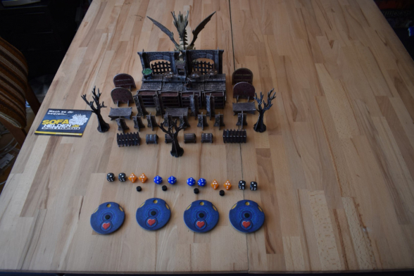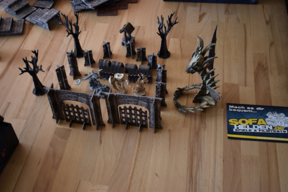 Der Spielaufbau gestaltet sich an sich relativ einfach. Man muss sich die kostenlose App herunterladen und wird dann durch den Aufbau geführt. Zunächst sucht man sich Helden aus, zu denen jeder Spieler das entsprechende Material erhält. Hierzu gehören die Heldenkarte, die Figur, das Lebensrad und die Startwaffen. Letztere haben noch eine Besonderheit. Jede*r Held*in hat davon zwei. Sie werden mit der „Upgrade-Seite“ nach innen in eine Hülle gesteckt, sodass eine Waffe auf der Vorderseite und eine auf der Rückseite zu sehen ist. Die Mitspielenden haben die Wahl, welche der Waffen oben liegt. Aus den übrigen Karten, Markern und Geländeteilen wird jeweils ein Vorrat gebildet. Dann geht es an den Aufbau des Szenarios. Dafür richtet man sich strikt nach der App, was man im Prinzip schon aus Spielen wie beispielsweise Herr der Ringe - Reise durch Mittelerde kennt. Dann kann es auch schon losgehen…