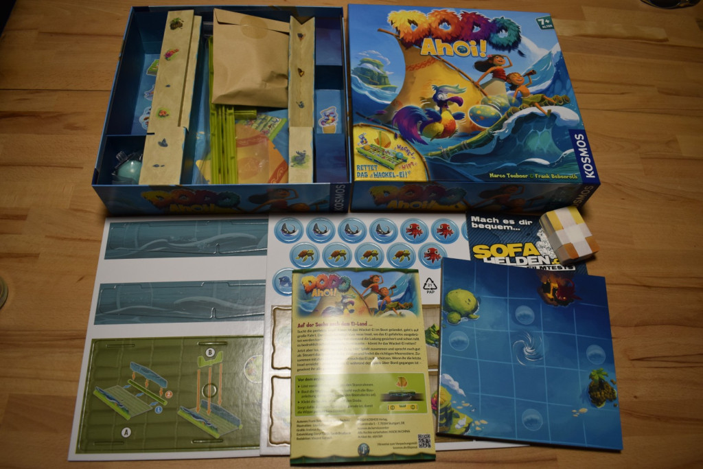 Ihr nehmt das Floß und stellt es in die Mitte. Daneben legt Ihr den Spielplan und verteilt auf den runden Feldern zufällig die Meerestiere. Den Stapel mit den Inselkärtchen mischt Ihr, nehmt entsprechend der Spielerzahl ein paar heraus und legt sie ungesehen zurück in die Schachtel. Die übrigen Karten legt Ihr als offenen Stapel neben den Spielplan. Die Spielkarten mischt Ihr und verteilt xxx an alle Mitspielenden. Die übrigen Karten werden als Nachziehstapel bereitgelegt. Die Dodofigur wird schon mal auf das Floß gestellt und das Ei sollte vorgewärmt bereitgelegt werden. Die Floß-Figur stellt Ihr auf die Startinsel. Nun solltet Ihr noch definieren, wer die Dodofigur bewegt, wer die Inselkärtchen umdreht und natürlich, wer die erste Karte legen darf. Dann kann es auch schon loslegen. Ihr legt das Wackel-Ei auf die Seite schräg gegenüber vom Dodo und dann geht es sofort los.