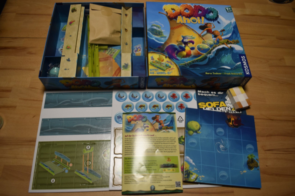 Neben zwei Stanzbögen mit den Teilen für das Floß und den Meerestier-Chips befinden sich noch der Spielplan, ein Kartenstapel, sowie das Kernelement des Spiels, das Wackel-Ei im Lieferumfang. Für das Floß sind noch zwei Kunststoffleisten enthalten, in die die Kartonteile eingesteckt werden müssen. Insgesamt ist das Spielmaterial von der Gestaltung her sehr gut gelungen und wirkt vor allem auf Kinder ansprechend. Ein witziges Detail, das unseren Kindern sofort auffiel: Mangalopanesia wurde als Startinsel gewählt. Positiv ist auch, dass das Floß beim Verstauen nicht abgebaut werden muss. Negativ ist, dass das Floß im Auslieferungszustand sehr rutschig ist und das am Ende den Spielspaß etwas trübt. Von unserer Seite aus, würden wir hier den Tipp geben, die Fläche für das Ei mit den Fingern etwas „abzurubbeln“, damit sie stumpfer wird und das Ei darüber rollt und nicht rutscht. Nachdem Ihr alles zusammengesteckt und ausgepöppelt habt, geht es an den eigentlichen Spielaufbau.