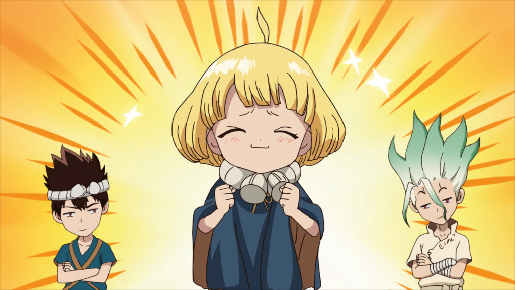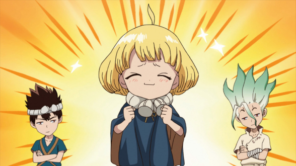 Beide nehmen ebenfalls am Wettkampf teil, um so viele Plätze zu belegen wie möglich. Letztendlich, nach vielen witzigen Szenen, wie ein Krieger mit Melonenhelm, sehr übertriebenen Zeichnungen, wie sich manche Krieger vorkommen, aber von allen anders wahrgenommen werden, schaffen es die Anhänger des Wissenschafts-Königreich den Wettkampf zu gewinnen. Zur großen Überraschung aller schafft es Senku, der Dorfälteste zu werden und bereitet sofort mit dem gewonnenen Alkohol die Medizin für Ruri her. Nach einer langen Nacht und unzähligen Schritten haben sie das erste Antibiotikum nach 3700 Jahren wieder erschaffen und Ruri verabreicht. Ein Sieg für die Wissenschaft!