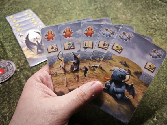 Und wenn man nichts ausspielen kann? Sollten die aktuellen Seiten des magischen Buches nicht passen, kann man in Phase 2 - vor dem Ausspielen der Karten in Phase 3 - eine Handkarte mit der Kartenrückseite nach oben auf den entsprechenden Stapel des magischen Buches legen, um so entweder Zahl und Belohnung oder die Drachenfarbe zu verändern. Die Manipulation des magischen Buches in Phase 2 ist also wichtig, um in Phase 3 auch Drachenkarten auslegen zu können. Umgekehrt ist es auch wichtig in Phase 1 Karten aus der Auslage zu nehmen, die eine strategische Manipulation des magischen Buches erlauben. Dazu ist auf den Vorderseiten der Buchkarten auch abgedruckt was auf der Kartenrückseite abgebildet ist.