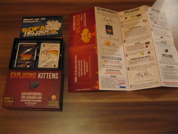 Exploding Kittens ist eine Art russisches Roulett mit Karten. Die Regeln sind sehr einfach und können innerhalb kürzester Zeit gelernt werden. Dementsprechend ist auch die Anleitung sehr kompakt und beschränkt sich auf das Wesentliche. Nichtsdestotrotz ist sie sehr ansprechend gestaltet und enthält viele Bilder. Das Spielmaterial besteht nur aus Karten, die sehr handlich und dem Spielprinzip entsprechend witzig gestaltet sind. Verpackt ist das Ganze in einem Karton, der sehr robust und wertig wirkt. Das Spielziel ist es, so lange wie möglich zu überleben, denn irgendwann erreicht einen eine „Exploding Kitten“, der man nur mit einer Entschärfung entkommen kann. Kann man das nicht, so explodiert man und scheidet aus. Der Spieler, der am längsten überlebt, gewinnt das Spiel.