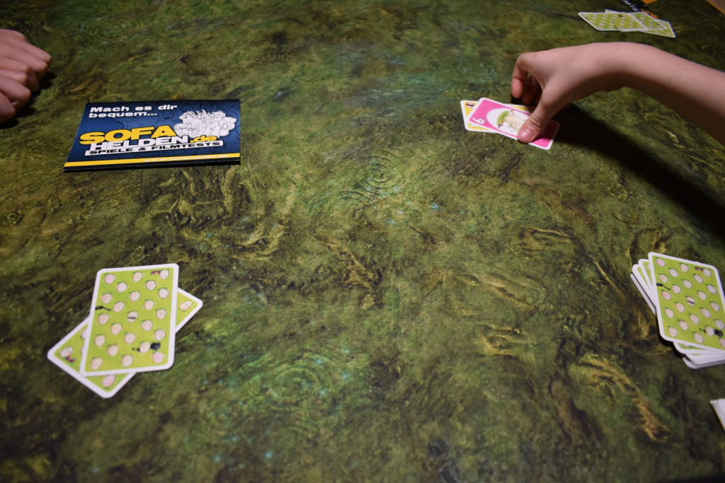 Das Spielprinzip von Feiges Huhn ist denkbar einfach. Seid Ihr an der Reihe, müsst Ihr entweder die oberste Karte Eures Stapels ausspielen oder die oberste Karte des Ablagestapels nehmen und unter Euren Stapel legen. Entscheidet Ihr Euch für die erste Variante, so müsst Ihr gucken, ob Eure gespielte Karte entweder den gleichen oder einen niedrigeren Wert oder dieselbe Farbe wie die oberste Karte des Ablagestapels hat. Ist das der Fall, passiert nichts, ist dem nicht so, müsst Ihr den gesamten Stapel nehmen. Dabei dürft Ihr Euch aber entscheiden, ob Ihr diese Karten als Minusstapel verdeckt vor Euch ablegt oder unter den Stapel Eurer Handkarten legt. Wenn Ihr Euch für die erste Variante entscheidet, müssen diese Karten aber dort liegenbleiben und dürfen nicht wieder zurück auf die Hand genommen werden. Sie können somit auch nicht wieder abgelegt werden.