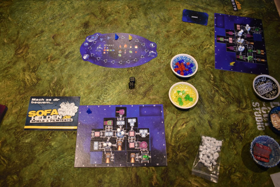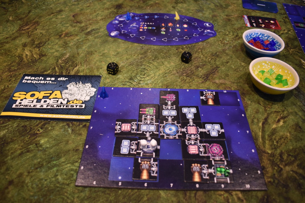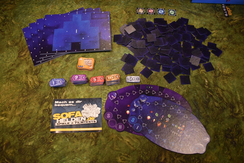 Für die erste Phase des Spieles legt Ihr die Raumschiffbauteile verdeckt in die Mitte. Parallel dazu sich alle je einen Schiffsplan und die zwei Raketenminiaturen in der gewünschten Farbe. Hinzu kommt noch eine zentrale Wohneinheit, die Ihr auf das Feld in der Mitte Eures Schiffsplanes legt. Dann kann es auch schon losgehen.