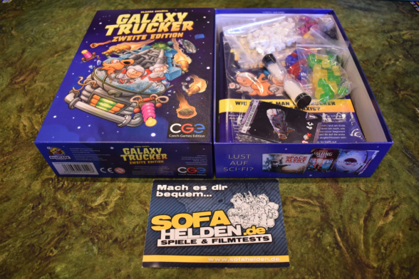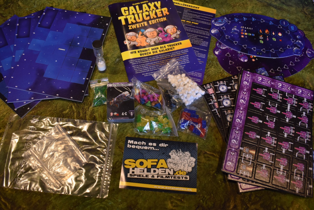Das Spielmaterial zu Galaxy Truckers sieht auf den ersten Blick übersichtlich aus, denn es liegt lose mit einigen leeren Zipp-Beuteln im Karton. Auf den zweiten Blick sieht man aber, dass es doch relativ umfangreich ist. Es gibt vier doppelseitige Schiffspläne, zwei doppelseitige Spielpläne, Stanzbögen mit Raumschiffbauteilen, einen eingeschweißten Kartenstapel und ein paar Zipp-Beutel mit Inhalt. Zu diesem gehören bunte Würfel, die die Waren darstellen, und Spielfiguren in Raketen- und Alienform sowie Astronauten. Für den zeitlichen Druck gibt es noch eine Sanduhr. Insgesamt macht das Spielmaterial - allem voran die Kunststofffiguren - einen sehr guten Eindruck. Das Design ist schlicht, passt aber sehr gut zum Weltraumsetting und gerade bei den Raumschiffbauteilen ist es wichtig, dass man nicht durch zu viele Details abgelenkt ist. Doch dazu später mehr.