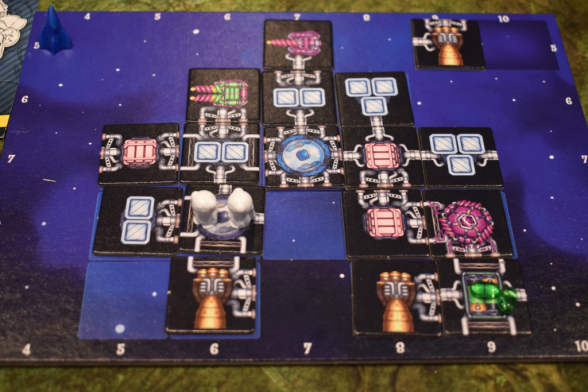 In der Tischmitte liegen viele verschiedene Teile als verdeckte Auslage. In der Bauphase spielt Ihr alle gleichzeitig, nehmt ein Teil, guckt es Euch an und verbaut es in Eurem Raumschiff oder legt es offen wieder zurück. Wichtig ist dabei, dass Ihr immer nur ein Teil gleichzeitig nehmt. Entscheidet Ihr Euch das Teil zu verbauen, müsst Ihr beachten, dass es drei Arten von Anschlüssen gibt: