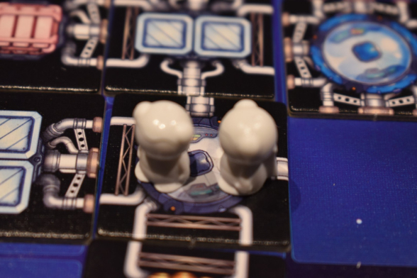 Für die Besatzung gibt es noch Kabinen und für die Energie Batterieteile. Um Fracht aufzunehmen, gibt es für rote Güter Spezial-Frachträume, die alle Güter aufnehmen können und Frachträume, die bis auf die roten Güter alle aufnehmen dürfen. Um Euch gegen kleinere Übel wie kleine Meteoriten zu wehren gibt es Schildgeneratoren. Diese schützen Euch gegen den Preis von Energie immer in zwei Richtungen. Die Verbindungsmodule sind wiederum funktionslos und helfen Euch nur beim Bauen. Ähnlich wie die Alienteile, die in den ersten Runden noch keine Rolle spielen.