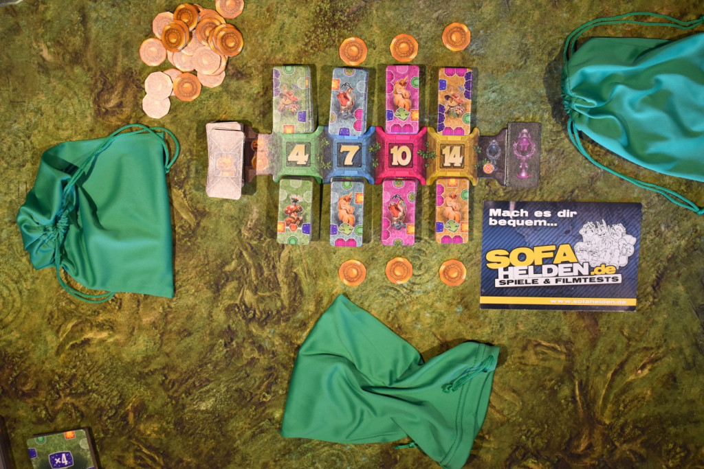 Für den Spielaufbau nehmt Ihr das Markttableau und legt es in die Tischmitte. Die Plättchen sortiert Ihr anhand Ihrer Rückseiten und mischt jeden Stapel gut durch. Anschließend teilt Ihr jeden in zwei auf und legt sie offen auf die beiden Seiten des Markttableaus mit der entsprechenden Zahl. Die Plättchen mit den Glücksschweinchen legt Ihr an das linke Ende, das Siegplättchen an das rechte Ende. Nun nehmt Ihr die Münzen und legt sie als Vorrat bereit. Sechs von Ihnen legt Ihr an jeden Stapel außer den beiden Vierern. Anschließend nehmt Ihr Euch jeweils einen Beutel und füllt ihn mit den Startplättchen auf: vier einzelne Gnome, zwei Doppelgnome und zwei Glücksschweinchen. Dann erhält die jüngste Person den Startmarker und Ihr beginnt das Spiel.