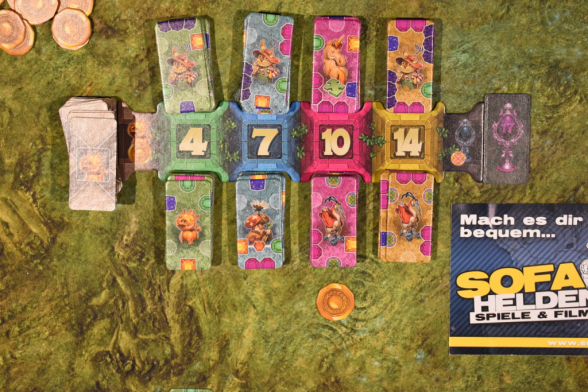 Im Anschluss an die Gartenbau-Phase könnt Ihr Gardlings anheuern. Dabei spielt Ihr nacheinander im Uhrzeigersinn, beginnend mit der Person mit dem Startmarker. Als erstes zählt Ihr, wie viele vollständige Edelsteine Ihr habt. Hattet Ihr einen Gnomalarm, müsst Ihr noch drei Edelsteine wieder abziehen. Von den übrigen dürft Ihr nun ein Plättchen vom Markttableau kaufen. Kauft Ihr Euch in den ersten Runden eines mit einer Münze daneben, erhaltet Ihr sie ebenso. Die Münzen könnt Ihr beim Kauf einsetzen, um euch die teureren Plättchen (außer das Siegplättchen) leisten zu können. Habt Ihr weniger als vier Edelsteine, so könnt Ihr Euch eines der Glücksschweine und eine Münze nehmen. Wenn Ihr Euch das Siegplättchen leisten könnt, kauft Ihr Euch dies und beendet damit das Spiel. Ihr habt gewonnen!