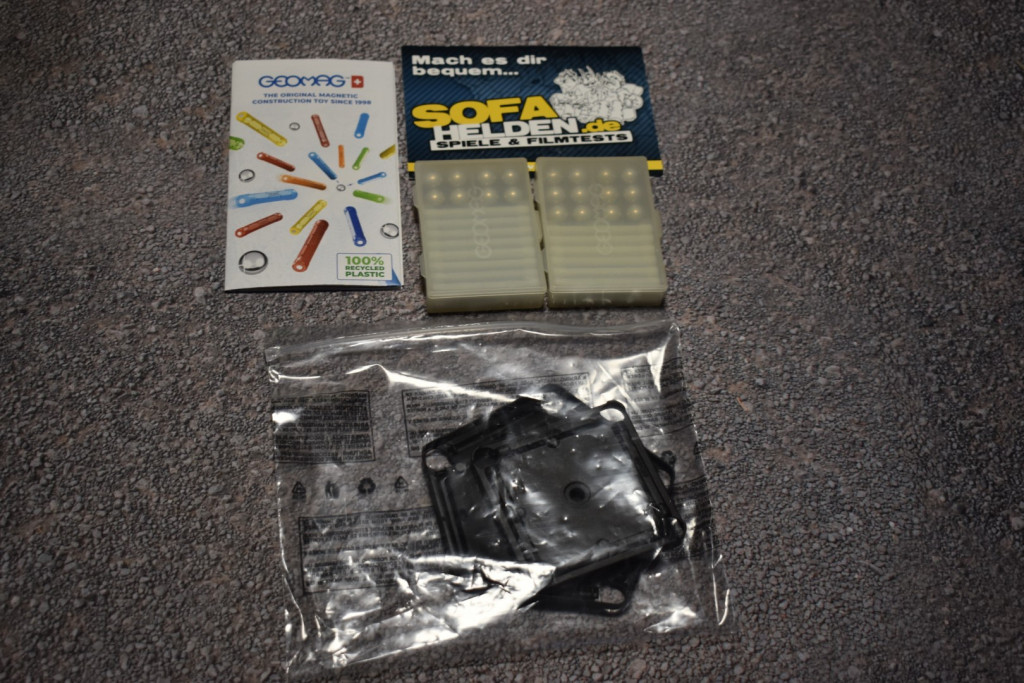 Dass die Magnetstäbe an sich nicht neu sind, sollte bekannt sein. Geomag bringt sie aber nicht nur durch die Verwendung von recycelten Materialien auf ein neues Niveau, sondern auch mit einer höheren Qualität und einer unserer Ansicht nach besseren Haptik erneut in den Fokus. Das Set besteht aus insgesamt 25 Teilen, zu denen vor allem die fluoreszierenden Magnetstäbe mit den Metallkugeln gehören. Darüber hinaus gibt es eine „Arretierung“ in Form einer Grundplatte, die man als Fundament für seine Bauwerke nutzen kann. Für die Stäbe und Kugeln liegt eine Kunststoffbox bei, in der das Material untergebracht werden kann. Die Grundplatte muss irgendwie separat aufbewahrt werden.
