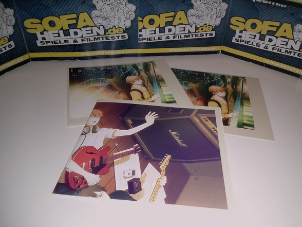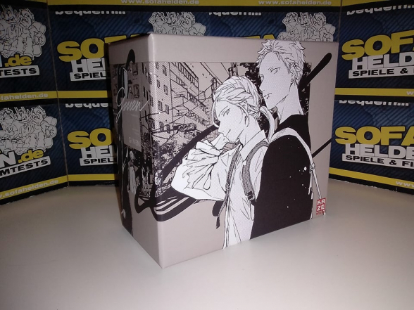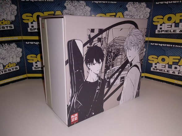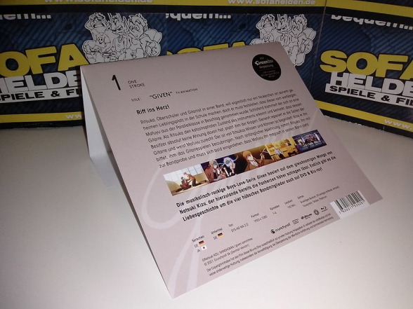 Kazé veröffentlicht Given in einem sehr ungewöhnlichen Format, das - passenderweise - an eine CD-Box erinnert. Untergebracht ist die Box in einem stabilen Sammelschuber, der auch den Folgevolumes Platz bietet. Der Sammelschuber zeigt die vier Hauptcharaktere im schwarz-weißen Manga-Stil, wogegen die CD-Box ein farbiges Szenenmotiv präsentiert, auf dem Mafuyu zu sehen ist. Umschlossen wird der Schuber von einer J-Card mit den Details und Infos zur ersten Box. Diese beinhaltet neben den ersten vier Episoden auf Disc ein schwarzes Given-Plektrum. Die übrigen Extras wurden im Platzhalter untergebracht. Dabei handelt es sich um eine Artcard sowie einen Sticker im Design des Box-Covers, ein "Tourposter" der Given Deutschland Tour 2021, ein 20-seitiges Artbook mit einer Übersicht der Charaktere sowie der gespielten Instrumente, sowie ein 8-seitiges Booklet mit einem Episodenguide.