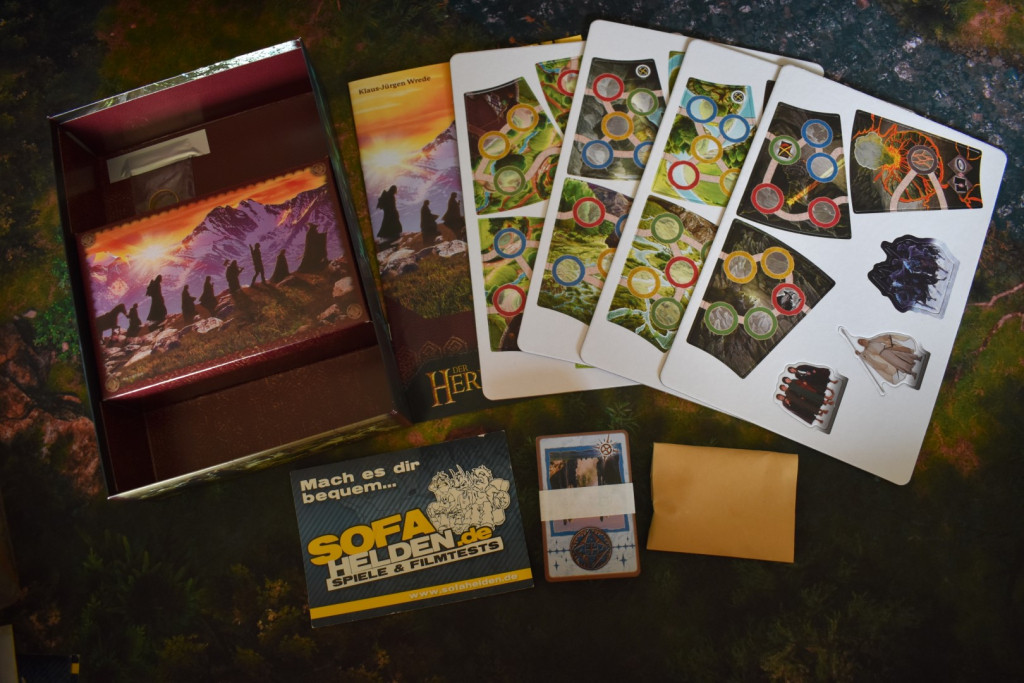 Schon bei einem ersten Blick auf der Spielwarenmesse Nürnberg 2024 war der Ring ein besonderes Highlight. Er sieht gut aus und ist sogar aus Metall, also wirklich ein echter Ring. Hinzu kommen ein Kartenstapel mit einer Banderole, die Figurenfüße in Papier verpackt und drei Stanzbögen mit den Figuren und Geländeteilen. Für das erste Spiel müsst Ihr also erst einmal die Geländeteile und Figuren auspöppeln und letztere mit den Standfüßen versehen.