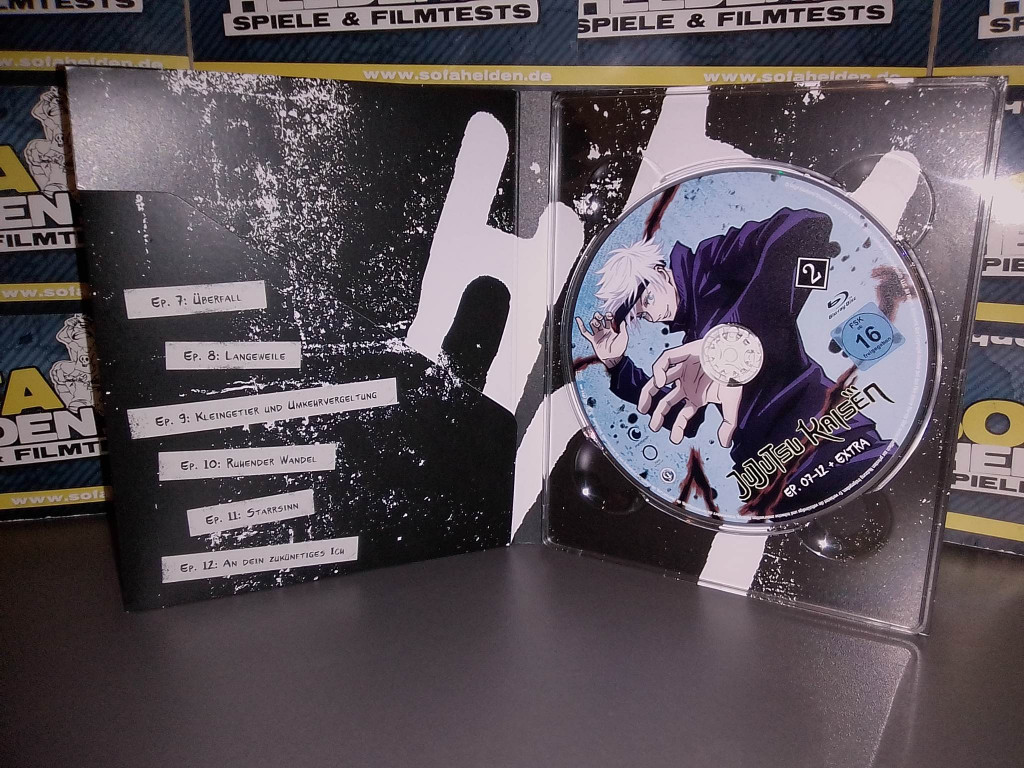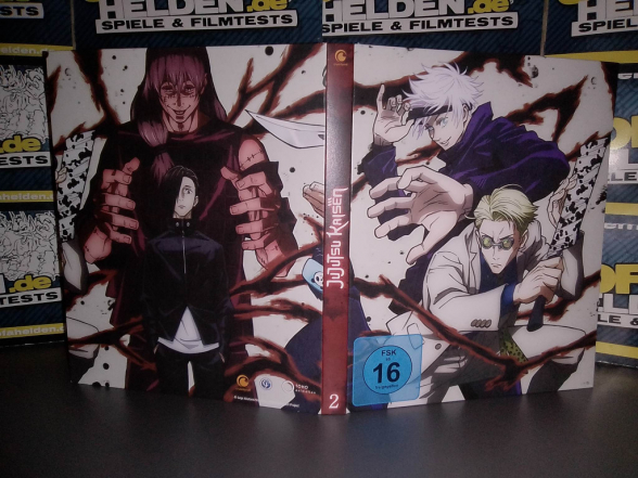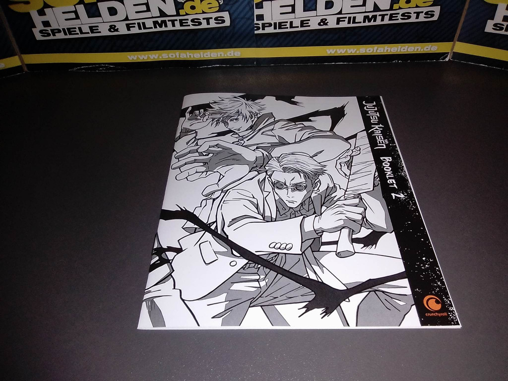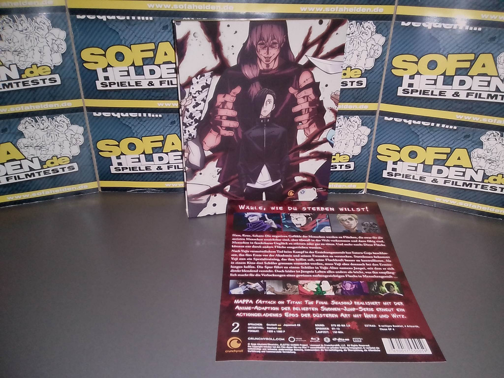 Crunchyroll veröffentlicht Jujutsu Kaisen - Vol. 02 als Digipack im Schuber, der von einer J-Card mit den üblichen Inhaltsangaben und Details umschlossen ist. Das Cover zeigt hier mit Satoru Gojo und Kento Nanami die zentralen Jujuzisten aus Volume 02, während die Rückseite Mahito und dem menschlichen Fluchkraftnutzer Junpei Yoshino gewidmet ist. Akzente auf den Motiven wurden auf dem Schuber durch ein glänzendes Finish vom übrigen Bild abgehoben, während das Digipack im Übrigen das gleiche Motiv zeigt. Das Digipack selbst beinhaltet neben der Disc eine Liste der Episoden im Innendruck sowie 4 Art-Cards und ein 8-seitiges Booklet. Die Art-Cards zeigen jeweils einen der Charaktere des Coverdesigns. Das Booklet besteht aus einem Interview mit den Originalsprechern von Yuji Itadori (Junya Enoki) und Satoru Gojo (Yuichi Nakamura), einem kurzen Episodenguide sowie einer Übersichtsliste von Staff und Cast.