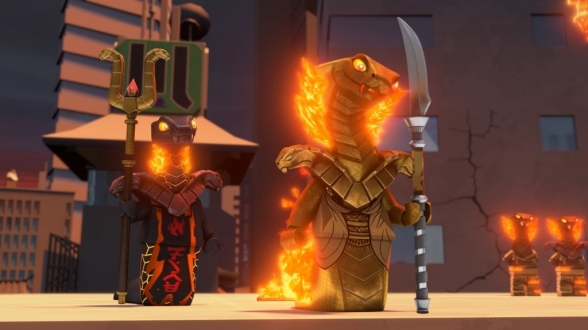 Dass es für Lego Ninjago nach dem grandiosen Abschluss in der zehnten Staffel schwierig werden würde, an das bisherige Niveau anzuknüpfen, das war abzusehen. Immerhin fand hier eine über mehrere Staffeln aufgebaute, umfassende Geschichte ihr episches und absolut gelungenes Ende, was einen absolut stimmigen Schlusspunkt setzte. Doch ein echter Ninja gibt eben nie auf, und so haben sich die Macher sichtlich Mühe gegeben, noch einmal eine Art Neustart zu markieren, und das nicht nur inhaltlich. Zwar gab es schon des Öfteren Schlangen als Gegenspieler in Lego Ninjago, doch die ägyptisch anmutende Herkunft und die magischen Fähigkeiten der neuen Gegner sind durchaus vielversprechend gestaltet worden und sorgen für erstes Interesse beim Zuschauer. Dabei vernachlässigt die Serie weder die rasanten Actionsequenzen, noch den typischen Humor - Letzterer wird sogar in einer kompletten Episode ausgiebig zelebriert. Eine echte Neuerung allerdings wirkt sich negativ auf den Gesamteindruck des Neubeginns aus: Die Episodenlänge und deren Aufbau. Zunächst einmal verzichtet Lego Ninjago nun auf ein Intro und liefert nur noch den bekannten Rückblick auf die vorherige Folge. Viel gravierender ist jedoch, dass jede Episode nur noch zehn Minuten lang geht. Auf diese Weise wirkt das Geschehen oftmals nicht nur sehr gehetzt, sondern verhindert auch, dass sich ein ansprechender Erzählfluss entwickeln kann. Selbst zusammenhängende Folgen bekommen so einen episodenhaften Charakter, in dem kurze Abenteuer und Probleme auftauchen, die innerhalb weniger Minuten abgehandelt werden müssen. Nicht gerade vorteilhaft, wenn man eigentlich darauf abzielt, eine gänzlich neue Handlung zu etablieren. Insgesamt beherbergt der Neustart für Lego Ninjago damit zwar durchaus Potential im Bereich der Geschichte, jedoch bleibt zu hoffen, dass man sich als Zuschauer an die neue Erzählstruktur und die gehetzte Inszenierung bald gewöhnen wird - ansonsten werden es die Ninja bei ihren zukünftigen Auftritten wohl schwerer haben als bisher. So richtig überzeugend ist das Ganze nämlich im Moment noch nicht, auch wenn sich die langjährigen Fans trotz aller Mängel recht schnell wieder zuhause fühlen werden...
