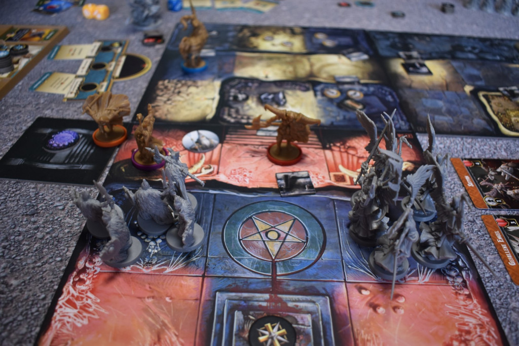Der Spielaufbau an sich ist im Grundsatz derselbe. Hier muss man nur die Quests in der angegebenen Reihenfolge (beginnend mit A) spielen. Natürlich muss auch das neue Spielmaterial mit in die Vorratsstapel eingemischt oder bereitgelegt werden. Erwähnenswerte Veränderungen sind die Stufentafeln, die jetzt auf der Rückseite bis zehn gehen und pro Stufe mehr Erfahrungspunkte benötigen, der Schatzbeutel, die Startgegenstände und die Türkarten. In den Schatzbeutel kommen nun nur noch zehn gewöhnliche Schatzmarker und ein seltener. Die Startkarten werden für die erste Quest wie gewohnt verteilt, in den folgenden Quests aber nicht mehr. Dafür nimmt man seine Ausrüstung in die nächste Quest mit. Da sich die Regelung mit den Schatzmarkern auch geändert hat, muss man von den Türkarten einige aussortieren. Eine weitere Änderung ist dann noch die Finsternisleiste, auf deren Schatzmarker-Felder nun zufällige Marker aus dem Schatzbeutel gelegt werden. Dafür ignoriert Ihr aber die aufgedruckten Marker. Sobald Ihr mit dem Spielaufbau durch seid, könnt Ihr mit dem Lesen der Questbeschreibung das Spiel auch schon beginnen…