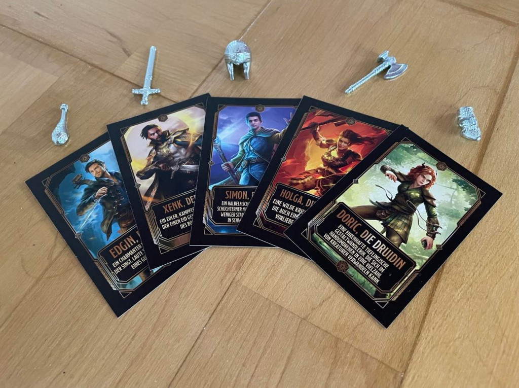 Das Spielbrett ist aus den herkömmlichen Monopoly-Varianten bekannt, doch hier fällt gleich auf, dass es weniger Felder sind. Auch gibt es keine 3er Straßenzüge, sondern jegliche farblichen Orte sind immer nur 2. Es ist also keine „geänderte“ Kopie, sondern in der Tat ein „neues“ Monopoly mit anderen Regeln und Zielen. Die Ereigniskarten heißen jetzt „Magie & Geheimnis“, die Bahnhöfe sind Portale und die Straßenkarten sind Orte, die man absichern muss (dazu später mehr). Die Vorbereitung ist allerdings genau so einfach, wie bei allen anderen Monopoly-Spielen. Jeder Spieler bekommt eine Figur und die dazugehörige Charakterkarte (kann spielentscheidend sein, denn jeder Charakter hat eine spezielle Fähigkeit), jeweils 5x10 und 5x50 Gold und es kann schon losgehen. Als Variante kann man zudem das Spiel anpassen, in dem ein Spielleiter gekürt wird, der dann ein paar Karten austauschen bzw. dazulegen kann, um so das Spiel schwerer und auch abwechslungsreicher zu machen.