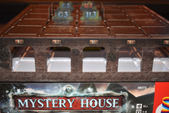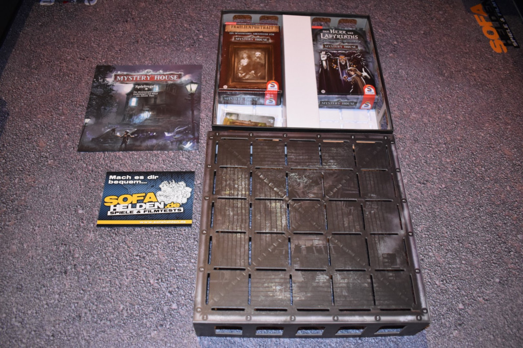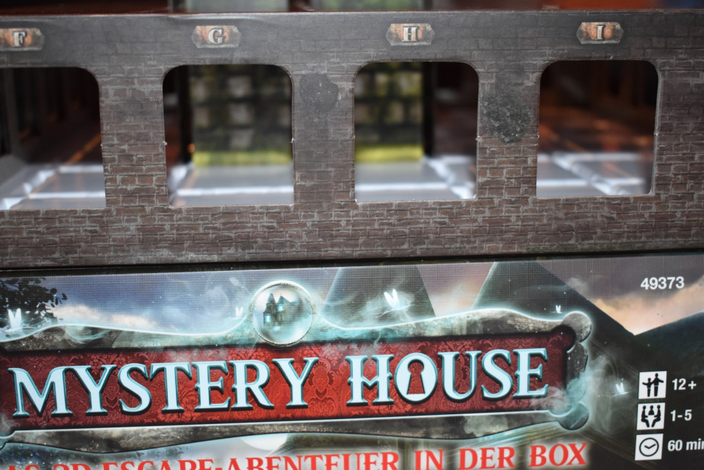Schon die Verpackung von Mystery House macht einen sehr guten Eindruck. Sie ist etwas angeraut und geprägt, erinnert von der Gestaltung aber fast schon etwas an einen Horrorfilm. Doch wer sich traut, die Verpackung zu öffnen, der wird belohnt werden. Im Inneren befinden sich das sogenannte Mystery House. Ein Karton mit vielen Schlitzen auf der Oberseite und vielen Sichtfenstern auf jeder Seite. Diese sind mit einem Raster aus Buchstaben und Zahlen versehen, sodass jeder der Schlitze auf der Oberseite eindeutige Koordinaten erhält. Der Karton lässt sich ähnlich wie eine normale Spielschachtel öffnen und besteht aus dem Deckel und einem Unterteil, das natürlich passende Aussparungen zu den Öffnungen im Deckel enthält, aber auch einen Kunststoffeinsatz, der das Gegenstück zu den Schlitzen im Deckel darstellt. Im Inneren befindet sich ein Plastikbeutel, zwei Kartons und eine Anleitung. Im Plastikbeutel befindet sich das Spielmaterial für ein zehnminütiges Tutorial, das einem das Spielprinzip näherbringen soll. Die Kartons sind zwei vollwertige Abenteuer, die jeweils eine Stunde in Anspruch nehmen sollen. Insgesamt macht das Spielmaterial einen sehr guten Eindruck. Die Ortskarten der Abenteuer könnten vielleicht etwas dicker sein, aber gerade der Karton ist sehr robust.