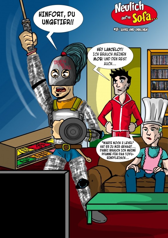 16.04.2013 von PanikmikeDer letzte Cartoon ist jetzt schon wieder über vier Monate her! Daher ist es langsam Zeit, Euch #8 von Neulich auf’m Sofa… zu präsentieren. Weil wir Drachen über alles lieben, und sie am liebsten in der Pfanne sehen, hat sich Mike auf die Jagd begeben. Ralf und Marcel finden das neue Spiel von ihm aber eher bescheiden, weil dieser nicht mehr aufhören kann – doch seht selbst in #8 Sofas und Drachen …