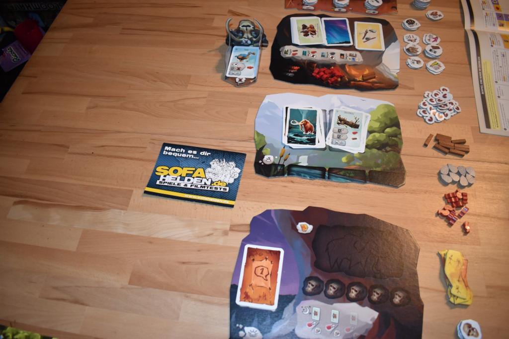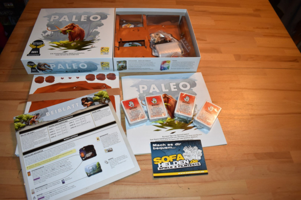 Die Anleitung zu Paleo wirkt in ihren Maßen und ihrem Umfang von zwölf Seiten sehr mächtig. Sie lässt sich aber sehr gut lesen und enthält viele Beispiele und große Illustrationen zur Veranschaulichung der Regeln. Letztere sind in sich logisch und schnell erklärt. Anfangs vermissten wir noch eine Übersichtskarte über den Rundenverlauf, dies ist aber eigentlich auch nicht notwendig, denn schon nach der ersten Runde ist der Spielverlauf klar und die Symbole der Karten verständlich (für Menschen, die des Öfteren Brett- und Kartenspiele spielen). Als Ergänzung gibt es noch das Bei“blatt“, das ein weiteres Heft ist, in dem die sieben Level und ein paar Besonderheiten zu bestimmten Karten beschrieben sind. Sie wird also hauptsächlich beim Spielaufbau benötigt.