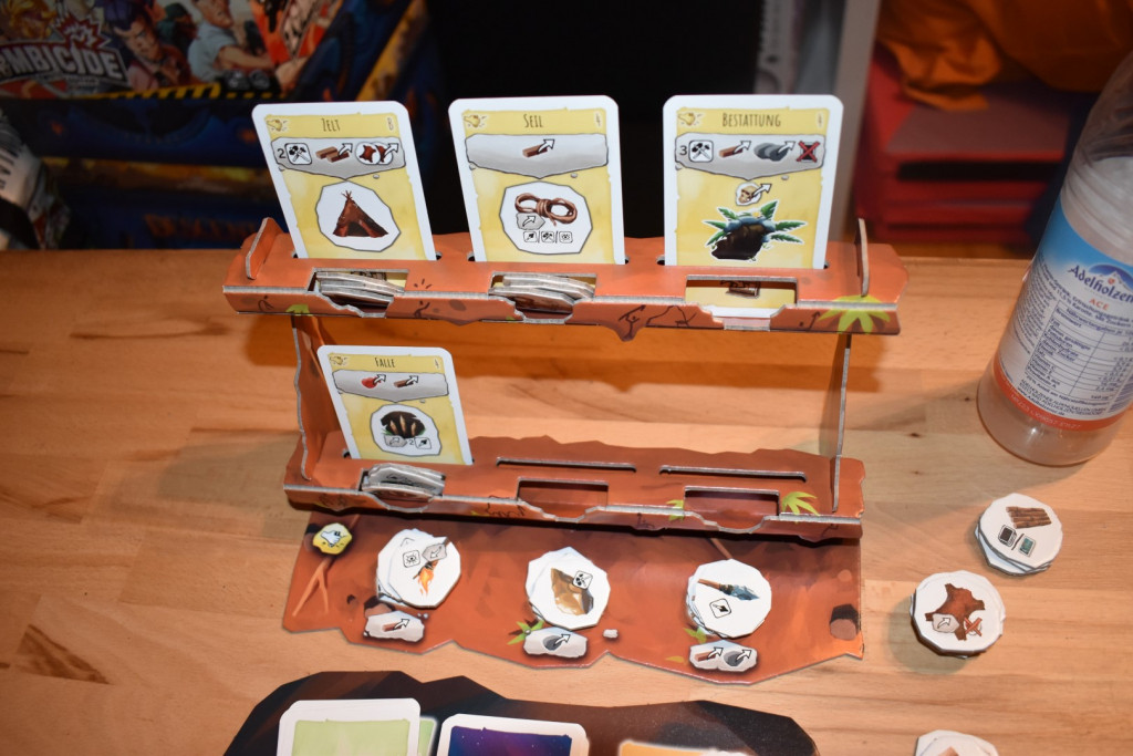 Beim Öffnen der Verpackung fallen einem zuerst die Stanzbögen in die Hände. Sie sind nicht eingeschweißt, sondern mit einer Kartonbanderole gebunden. Hier gilt es einige Plättchen zu pöppeln, aber auch den Friedhof und die Werkbank zusammenzubauen. Besonders letztere ist ein Highlight des Spiels. Hier finden Karten und Werkzeugplättchen perfekt Platz. Darüber hinaus gibt es noch einige Ressourcen aus Holz, zwei Würfel sowie drei eingeschweißte Kartenstapel. Diese müssen noch nach Zahlen und Buchstaben sortiert und anschließend in die beigelegten Zip-Beutel verstaut werden. Hierbei sollte man darauf achten, die Karten nicht mehr als notwendig anzusehen, um Spoiler zu vermeiden.