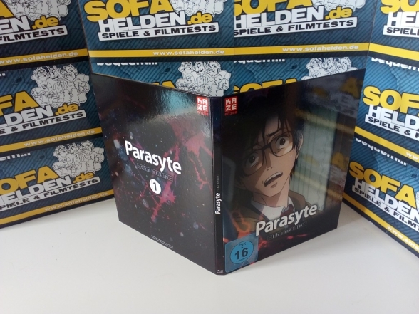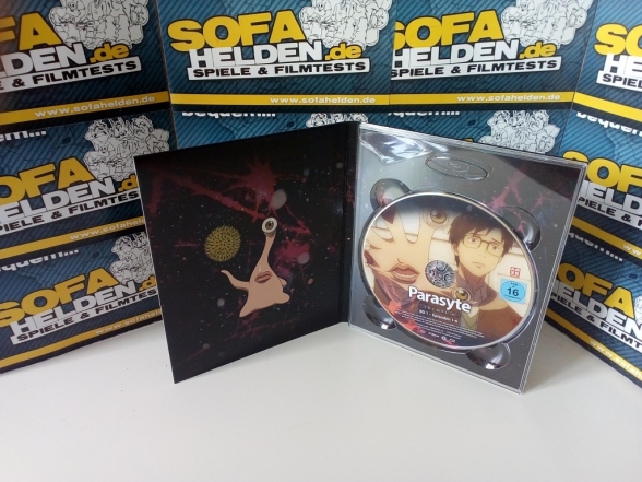 Der stabile Sammelschuber, der Platz für alle folgenden Volumes bietet, zeigt das verstörende Bild eines Parasiten nach der Verwandlung, welches sich auch auf dem beiliegenden Brillenputztuch wiederfindet. Die Disc selbst befindet sich in einem kleinen Digipak, welches sich in einem separaten Pappschuber befindet. Der Schuber zeigt ein Bild von Shinichi und Migi, welches auch die Disc selbst ziert, während auf der Rückseite die üblichen Details und Inhaltsangaben zu finden sind. Diese befinden sich auch noch einmal auf einem ablösbaren Detailblatt auf der Rückseite des Sammelschubers.