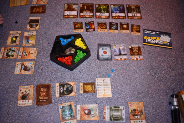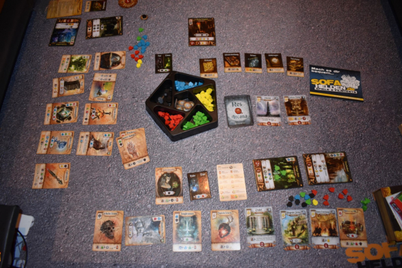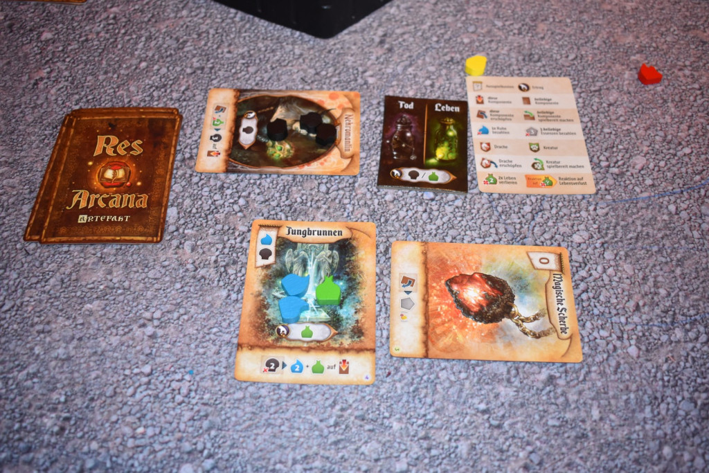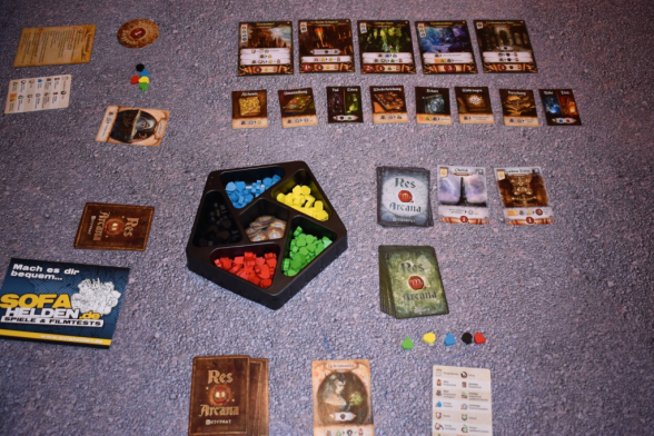 Res Arcana spielt sich, gemäß der Anleitung, in vier bis sechs Runden, die aus mehreren Phasen bestehen. Hierzu gehört als erstes die Ertragsphase, bei der Jede*r die Ertragsvorteile abhandeln und die Essenzen von den Komponenten nehmen darf. Darauf folgt die wohl längste Phase, die Aktionsphase. Dabei führen alle Reihum eine Aktion aus. Das geht so lange bis alle gepasst haben und die Runde so endet. Zu den Aktionen gehört es Artefakte auszuspielen, Monumente oder Orte in Besitz zu nehmen, Artefakte abzuwerfen für Essenzen oder Fähigkeiten auszuspielen. Bei den ersten Aktionen müssen jeweils die Essenzen bezahlt werden, die für das Artefakt, Monument oder den Ort benötigt werden. Sie sind also eine Art Währung. Das Abwerfen der Artefakte erklärt sich im Prinzip von selbst. Die Fähigkeiten sind auf den jeweiligen Karten aufgedruckt und beschreiben durch die Piktogramme im unteren Bereich, was man tun muss, um bestimmte Essenzen oder Effekte zu erhalten. Im Regelfall gehört hierzu auch, die Komponente zu erschöpfen. Damit ist sie für diese Runde nicht mehr verfügbar. Sobald man keine Aktionen mehr durchführen kann oder möchte, passt man. Ist man der oder die Erste beim Passen, so erhält man den Startspielermarker. Anschließend tauscht man seinen magischen Gegenstand gegen einen anderen und dreht ihn auf die „Gepasst“-Seite. Außerdem zieht man sich ein neues Artefakt. Sobald alle Mitspielenden gepasst haben, folgt die dritte Phase, bei der überprüft wird, ob jemand die Grenze von zehn Siegpunkten erreicht oder überschritten hat. Ist das der Fall, endet das Spiel, ansonsten dürfen alle ihre erschöpften Komponenten spielbereit machen und eine neue Runde beginnt.