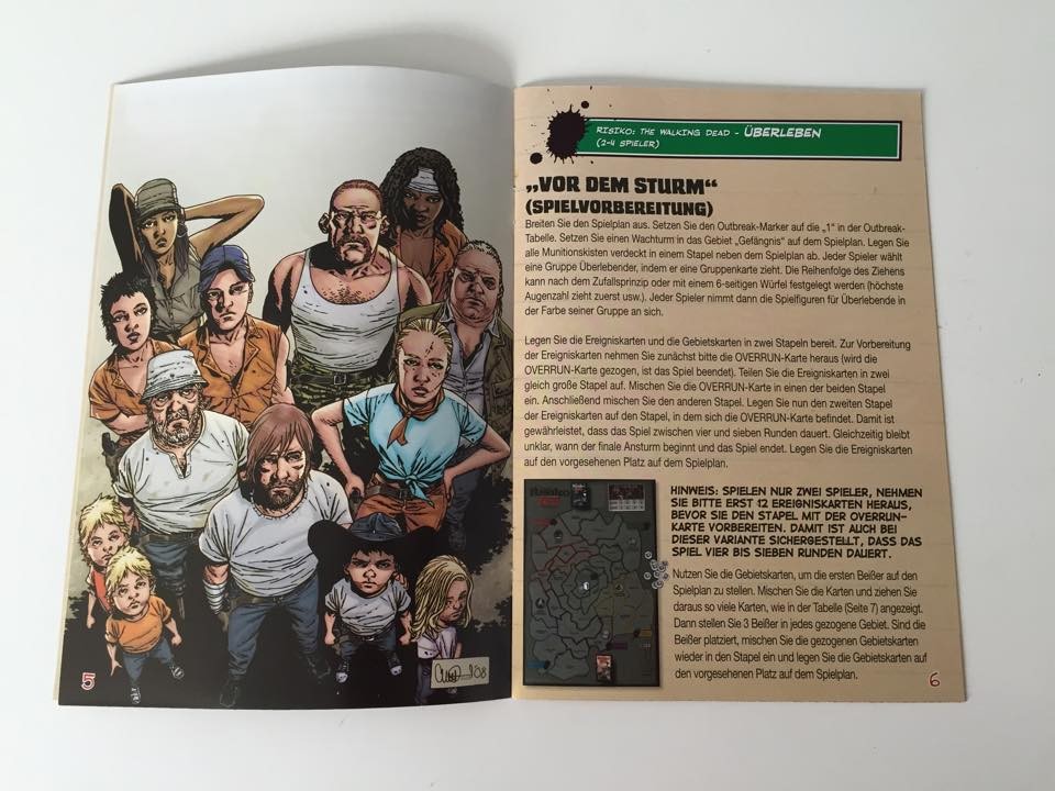 Die Anleitung erstreckt sich auf 18 Din A4-Seiten, wobei es nicht so viel zu lesen gibt. Zum einen werden zwei verschiedene Varianten beschrieben, zum anderen gibt es viele Bilder und Beispiele. Im Vergleich zum normalen Risiko gibt es hier nur ein paar Sonderregeln. Diese muss man aufmerksam lesen, denn die sie sind sehr wichtig. So hat man im Kampf zum Beispiel automatisch einen Bonus von +1 auf das Würfelergebnis, wenn ein Spieler gegen die Beißer kämpft. Ebenso gibt es zwei neue Objekte (Handgranate und Wachturm), die den Spielern im Kampf sehr behilflich sein können. Neben den normalen Gebietskarten gibt es auch Ereigniskarten, welche den Spielern Vor- aber auch Nachteile bringen. So kann es zum Beispiel passieren, dass Armeen in einer Zone sterben, Zombies in ein Gebiet einfallen oder aber der Spieler einen Würfelbonus bekommt.