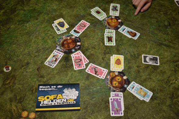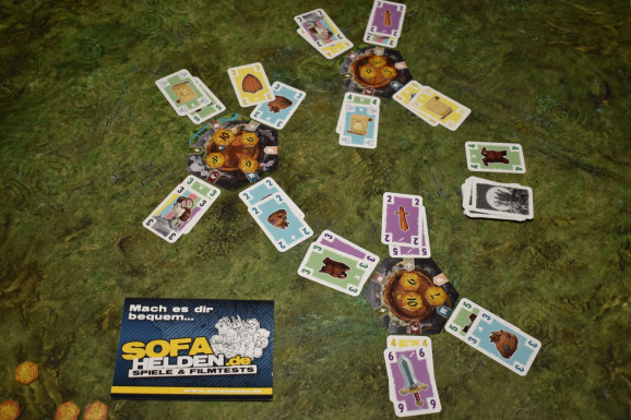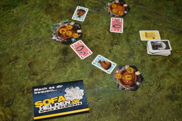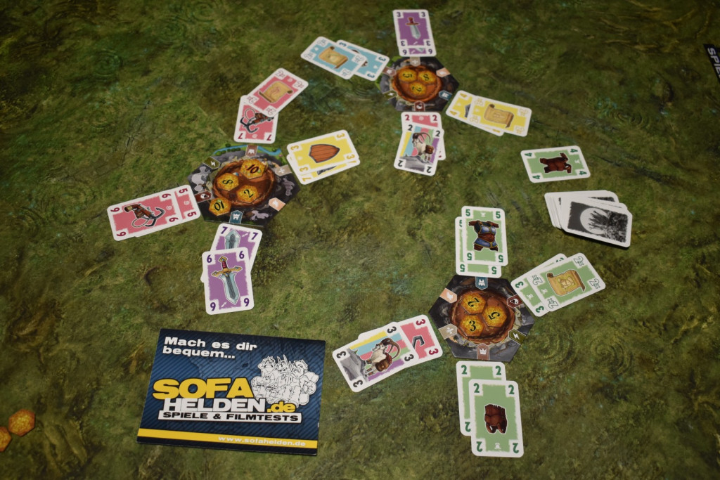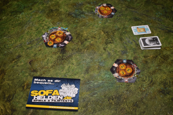 Bevor es an das Plündern der Schätze geht, müsst Ihr noch ein paar Sachen vorbereiten. Als erstes legt Ihr die drei Nester in die Tischmitte. Am besten so, dass die Symbole alle gleich ausgerichtet sind und an jedem Nest genug Platz für die anzulegenden Karten ist. Nun sortiert Ihr die Karten nach Ausrüstungs- und Gildenkarten. Von letzteren sucht Ihr Euch jeweils eine aus und legt sie vor Euch aus. Die Ausrüstungskarten werden gemischt und Ihr erhaltet davon jeweils fünf Handkarten. Die übrigen werden als Nachziehstapel mit einer offenen Karte bereitgelegt. Nun nehmt Ihr die Schatzchips und mischt sie. Auf jedes Nest kommt ein Schatz weniger als Personen mitspielen. Die Schätze im Nest deckt Ihr auf, die anderen legt Ihr verdeckt beiseite. Nun legt Ihr noch den Zehnerschatz auf das größte Netz und gebt den Startchip an die Person, die am besten schleichen kann.