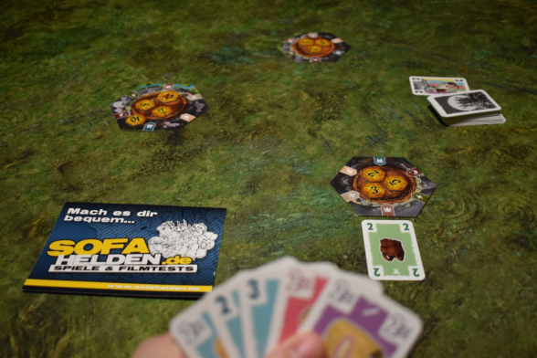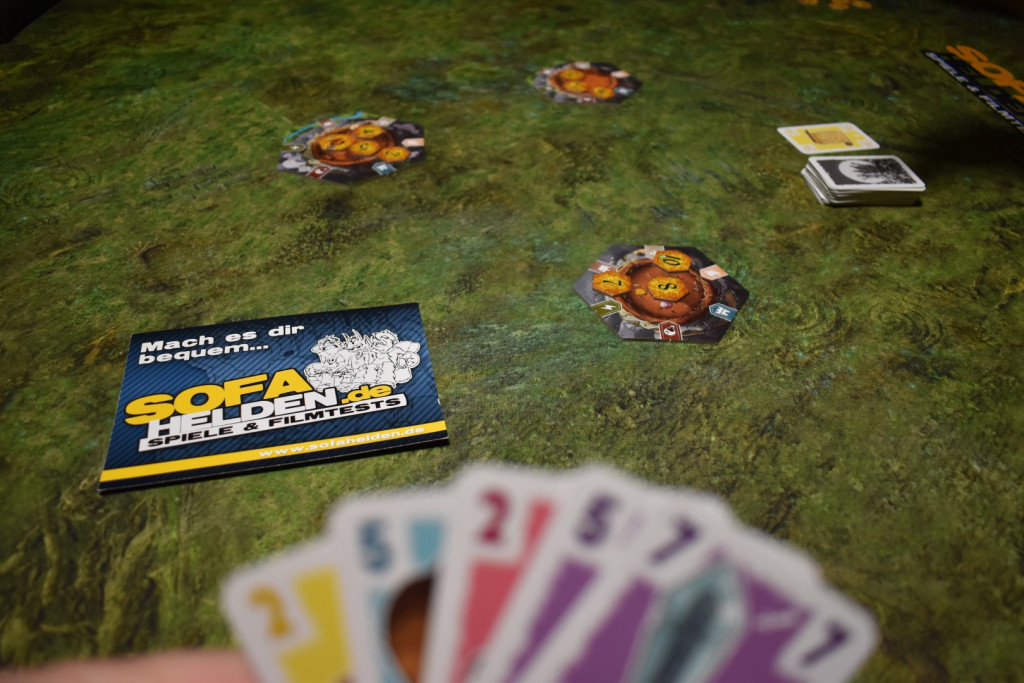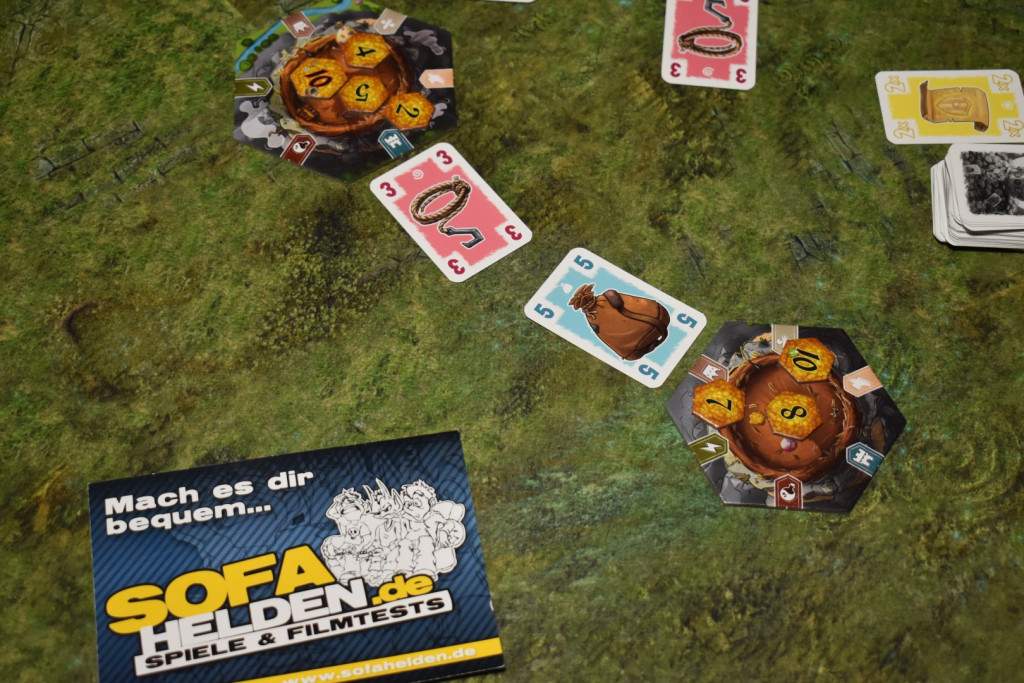 Am Rundenende werden die Schätze verteilt. Da merkt man wieder den Reiner Knizia, denn einfach die Werte zusammenzählen wäre ja zu einfach. Ihr prüft bei der Auswertung eines Nestes, wie viele Übereinstimmungen Eure Karten an diesem Nest haben. Stimmen sie in zwei Eigenschaften, also Farbe und Zahl überein, so hängt Ihr die beiden Zahlen der Karten einfach aneinander und erhaltet so eine zweistellige Zahl. Habt Ihr nur eine Übereinstimmung, so bildet Ihr aus beiden Zahlenwerten die Summe. Stimmt bei den Karten gar nichts überein, zählt nur der höhere Wert der beiden Karten. Damit aber nicht genug: es gibt auch Joker, die noch relativ einfach zu werten sind, da sie einen Zahlenwert haben, aber in ihrer Farbeigenschaft beliebig gewertet werden können. Dann gibt es aber noch die 2x-Karten. Sie könnt Ihr nur bei der Variante „Eine Übereinstimmung“, nämlich der Farbe, werten. Sie Multiplizieren den Wert der anderen angelegten Karte mit 2. Leer geht Ihr dagegen aus, wenn Ihr zwei 2x-Karten an einem Schatz anlegt. Nun dürft Ihr Euch in absteigender Reihenfolge - mit dem höchsten Wert beginnend - die Schätze aus dem Nest aussuchen und verdeckt vor Euch ablegen. Anschließend fahrt Ihr mit dem nächsten Nest fort bis Ihr alle Nester geplündert habt.