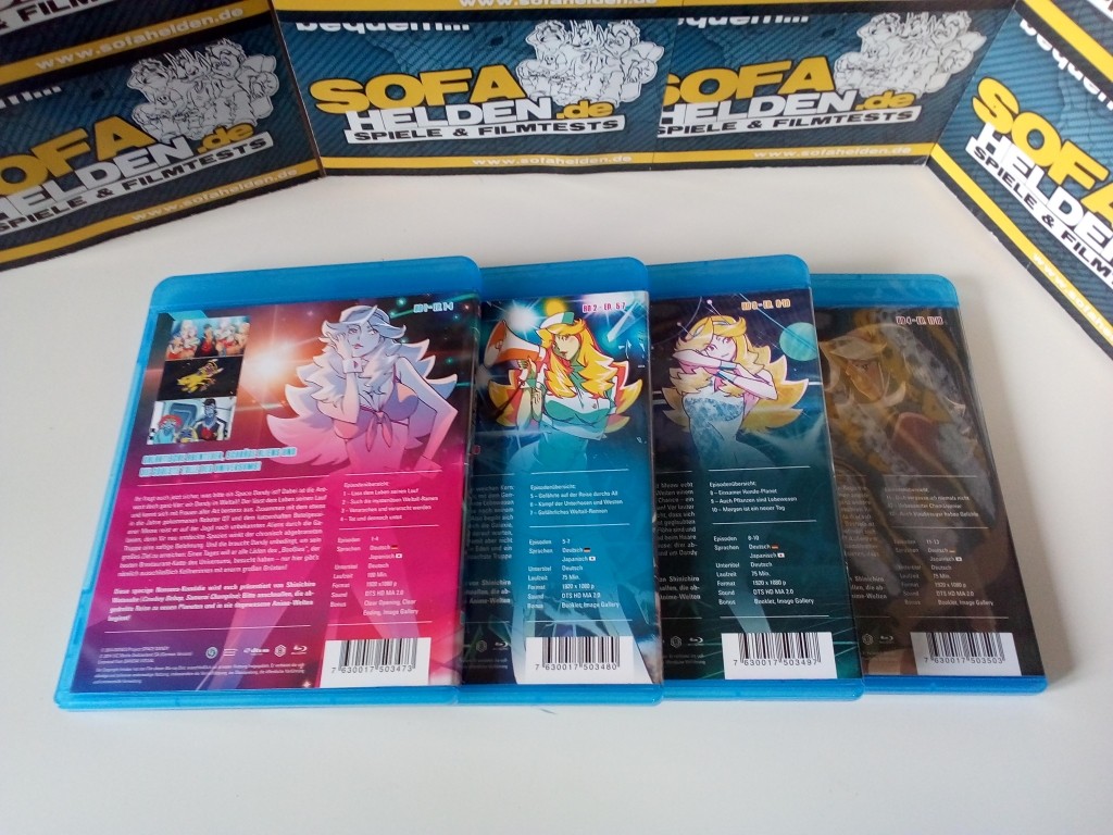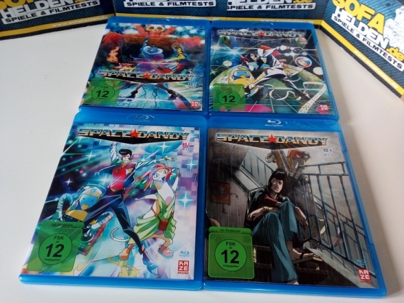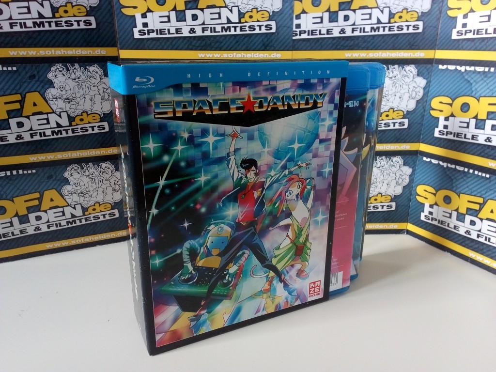 Die Gesamtausgabe von Space Dandy lässt kaum Wünsche offen. Als Sammler bekommt man von Kazé Anime einen stabilen Schuber geliefert, in dem sich die komplette Serie, verteilt auf vier Discs in jeweils eigener Amaray-Hülle, befindet. Sowohl der Schuber als auch die vier Amarays zeigen jeweils ein stylisches Dandy-Motiv in abgefahrenem Retro-Look und halten auf der Rückseite die entsprechenden Informationen und Details zur Disc parat. Alle Amarays verfügen über ein Wendecover ohne FSK-Logo. Außerdem befindet sich in den Volumes zwei bis vier jeweils ein Booklet, welches neben Bildern und Hintergrundinformationen zur Serie auch zahlreiche Interviews mit Regisseur und Crew beinhaltet.